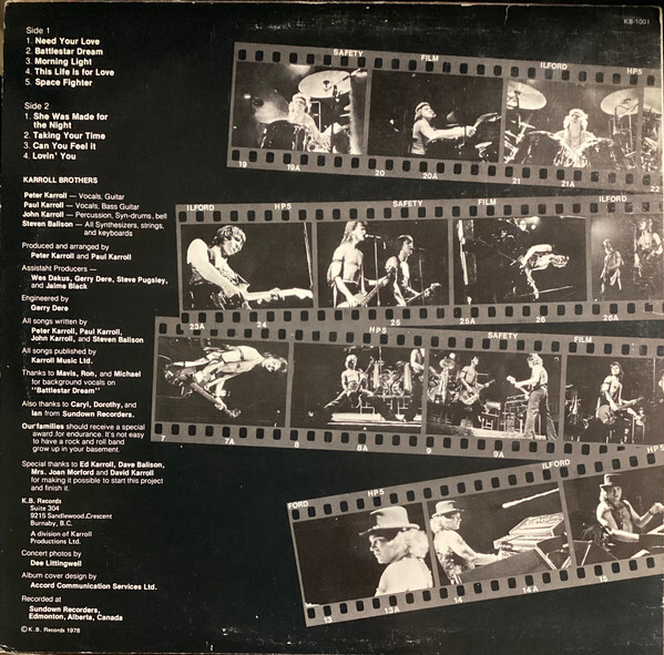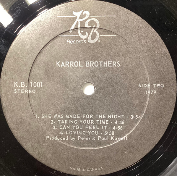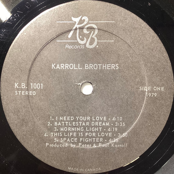 In 1979 the Karroll Brothers launched their own KB Records imprint and released their self-titled debut LP (Karroll Brothers, KB 1001). Issued alongside the album were two singles from the same sessions: Morning Light b/w Need Your Love and She Was Made For The Night, the latter presented in both short and long versions. Together, these releases marked the band’s most ambitious statement yet—songs like “Battlestar Dream” and “Morning Light” revealed a flair for dramatic arrangements, complex interplay, and tight harmonies, while “Need Your Love” brought a more immediate rock punch. Their live takes of “Need Your Love” and “If I Can Fall In Love” even appeared on CFOX’s Vancouver Seeds compilation, helping spread their name beyond the bar circuit and onto the radios of the West Coast.