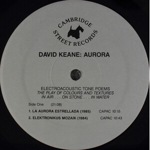 Keane was an Associate of the Canadian Music Centre and a member of the Canadian League of Composers, and he is represented on dedicated albums—Lyra, Aurora (Electroacoustic Tone Poems), and Dialogics—as well as on compilations such as The Anthology of Canadian Music. His vinyl-era output was later gathered in a two-disc anthology issued in April 2023, drawing together Lyra (Music Gallery, 1979), Aurora (Cambridge Street Records, 1985), and his CAPAC “Portrait Musical” single, with contextual material from the original releases.