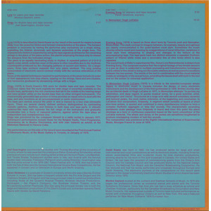 The performances on this side of the record were recorded at the First Annual Festival of Electronic Music, at the Music Gallery in Toronto, in January of 1979.