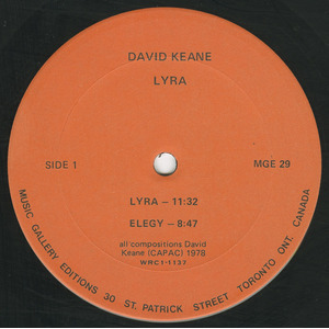 David Keane was born in 1943. He produced works for large and small instrumental and vocal combinations as well as electroacoustic scores, including three operas and much music for dance, film, and theatre. His works were performed throughout Canada, the USA, Europe, and Cuba. He received grants and commissions from the Canada Council, Ontario Arts Council, the Laidlaw Foundation, the CBC, the National Film Board of Canada, the Ontario Science Centre, and the National Design Council. He acted as adjudicator for the National Design Council, the Laidlaw Foundation, and the Canadian Broadcasting Corporation, and produced music for both the CBC and the National Film Board. He was an Associate of the Canadian Music Centre, a member of the Canadian League of Composers, and a founding member of the International Confederation for Electroacoustic Music. Beginning in 1970 he taught at Queen’s University in Kingston, where he founded and directed the Queen’s Electroacoustic Music Studios. His record Lyra was recorded at the Queen’s University Electronic Music Studios.