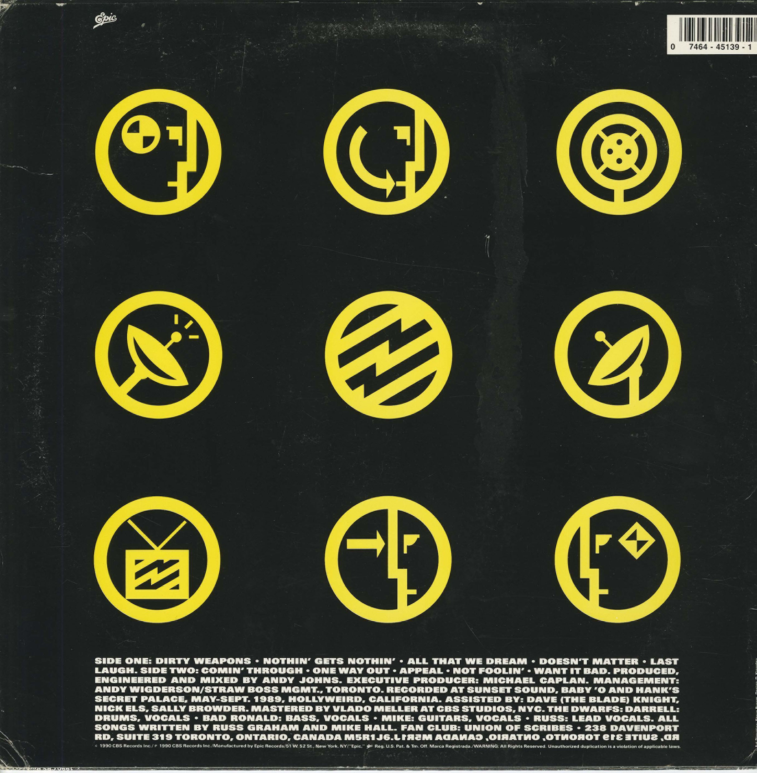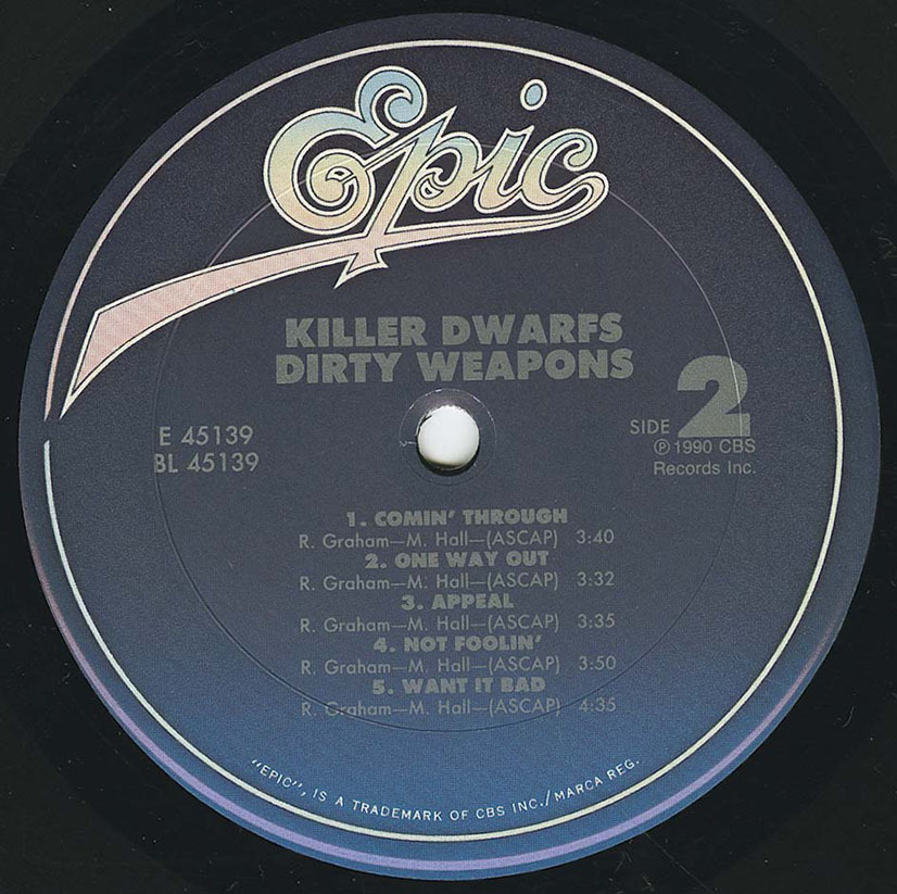 For Dirty Weapons (1990), Killer Dwarfs worked in Hollywood with legendary producer Andy Johns (Rolling Stones, Led Zeppelin, Rod Stewart). The album delivered their biggest U.S. radio moment with “Doesn’t Matter,” which topped rock charts in multiple cities, while the title track gained MTV exposure. The record became their highest-charting U.S. album and earned a 1991 Juno nomination for Best Hard Rock Group, though the award ultimately went to Rush.