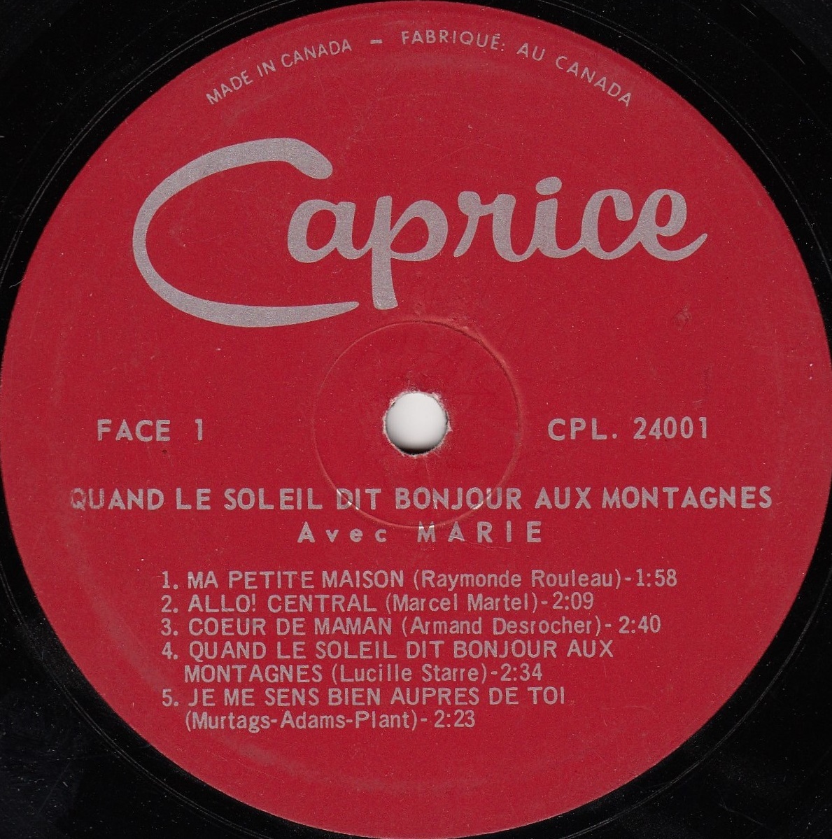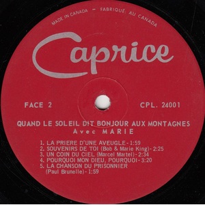 Marie King quickly became a prominent part of The Bob King Show, performing songs both in English and French. They recorded duet material, often with Marie singing French lyrics to Bob King favourites including his signature song "Laurel Lee". The couple toured extensively in Ontario and in Quebec, where Marie King quickly became a high-profile French language country recording star, releasing dozens of hit albums on the Quebec market for such labels as Trans-World, Caprice, Paysanne, Souvenir and Bonanza. Several of Marie King’s Christmas music albums as well as her "Golden Hits" and "Quand Le Soleil Dit Bonjours Aux Montagnes" albums were all certified Gold-Selling albums. Marie King was also a gifted songwriter, with two of her more popular hits, "Ma Petite Carole" and "Allon Mon Petit Bobby", both inspired by her children. Meanwhile, husband Bob King was enjoying similar success with songs like "My Petite Marie" and "French Canadian Girl", both inspired by his wife, Marie King.