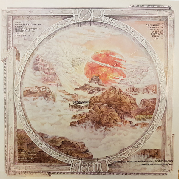 Now, hundreds of thousands of fans later, Klaatu returns with their second Capitol album, Hope, a thematically linked science fiction fantasy (Klaatu considers it the second chapter of the story begun on the first album). Hope plots the course of a group of space travelers who visit the remnants of a distant planet (the same one that blew up on the first record). They had recently discovered the asteroid due to a fine, but intense shaft of light that emanated from its surface. The fragment of planet was one of the many pieces that were hurled across the universe by the holocaust that destroyed the planet Klaatu on the first album. The bits of planet formed a huge asteroid belt which came to be known as the space graveyard. The visitors discover an ancient civilization called Politzania which also was destroyed in the explosion. Yet amidst the ruins a lighthouse beams in the night manned by the only survivor of the planet, the old lighthouse keeper. The lighthouse with its laser flare (which the visitors followed to the planet) warns interstellar travelers of the impending danger of the solar reef. The keeper of the light has spent his life searching for a philosophy, prayer, or phrase that might help bring eternal peace. Klaatu sings: "When to his end the old man came, Death told him, 'You'll not die in vain'... And had we heard his parting word, we'd know that he had said... Hope."