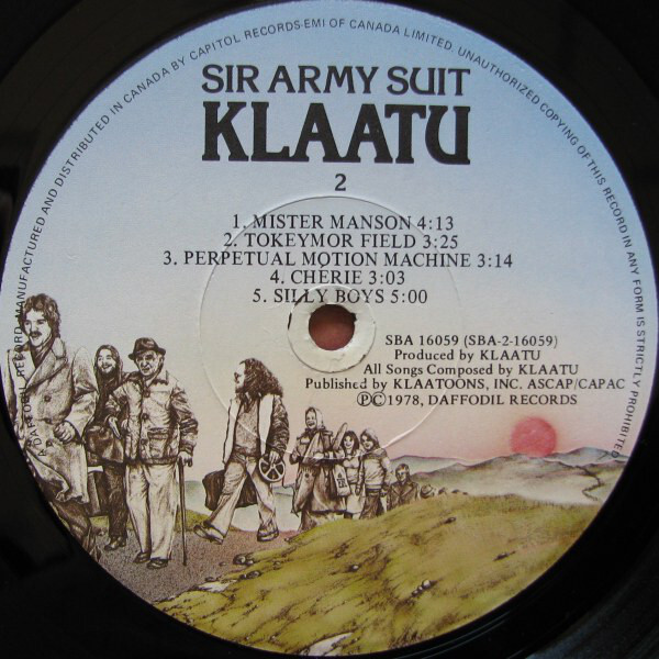 Side Two opens with "Mister Mansion", a hard-rocking tune about two highly controversial figures of the Sixties -- Charles Manson ("...he'll take a thing called love and make you hate it...") and Tim Leary ("...tell me won't you Mr. Leary / keep your little pills...") -- with great production touches (percussion, ringing bells, backward tape, etc.). By contrast, the light, airy "Tokeymore (sic) Field" relives simple childhood pleasures, such as frolicking in a meadow with a loved one. "Perpetual Motion Machine" is an uptempo acoustic rocker with smoothly textured, somewhat spacey vocals and synthesizer arrangements, and lyrically it's an update of Simon and Garfunkle's "Big Bright Green Pleasure Machine". Next is "Cherie", a neo-Baroque love song with string quartet and harpsichord instrumentation. Closing Sir Army Suit is "Silly Boys", a bizarre shuffle rocker that pulls together many aspects of KLAATU's studio sorcery -- flanged vocals singing backward, sound effects and a sustained sitar chord on the fade, for example.