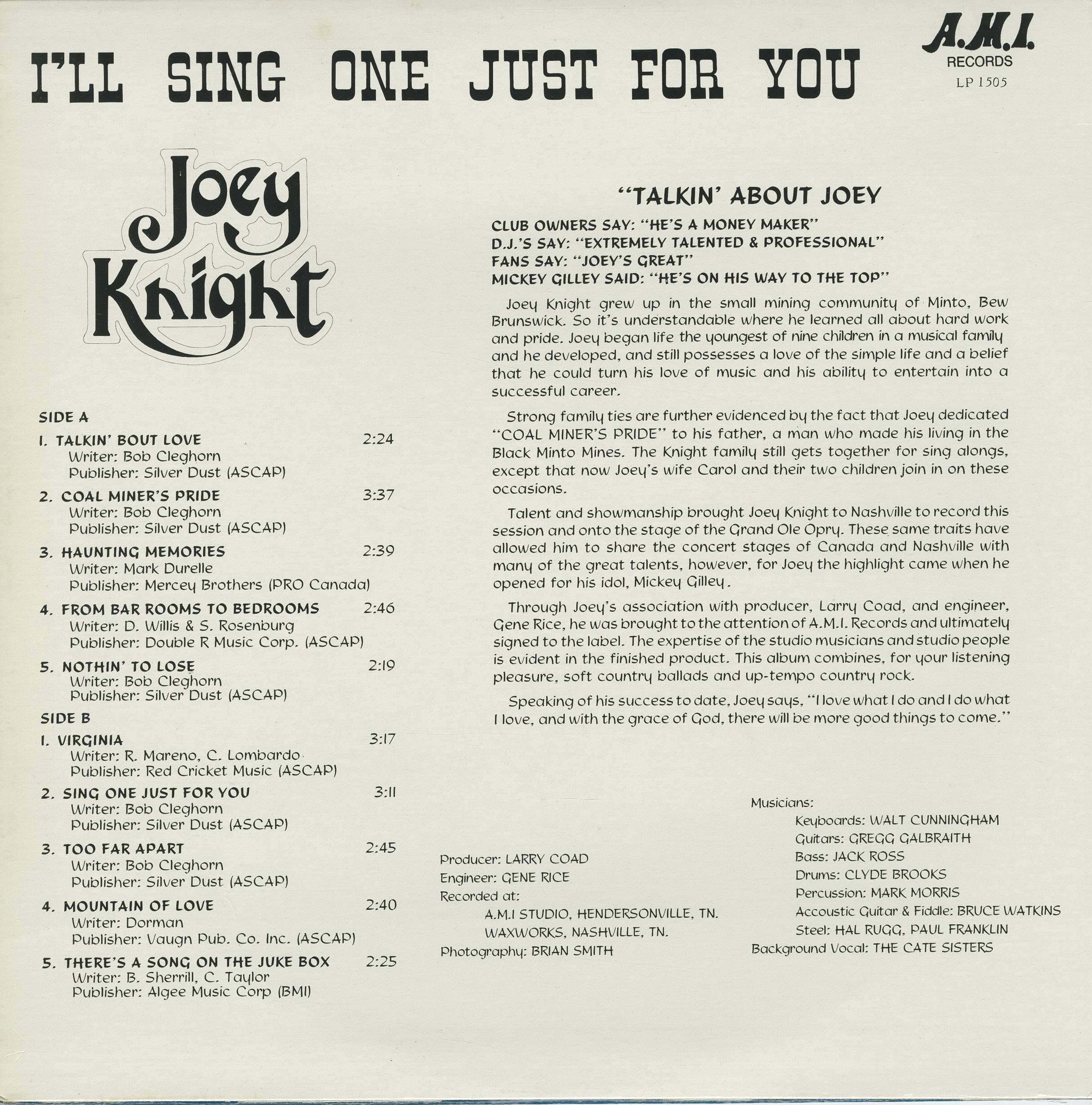 Through Joey’s association with producer, Larry Coad, and engineer, Gene Rice, he was brought to the attention of A.M.I. Records and ultimately signed to the label. The expertise of the studio musicians and studio people is evident in the finished product. This album combines, for your listening pleasure, soft country ballads and up-tempo country rock.