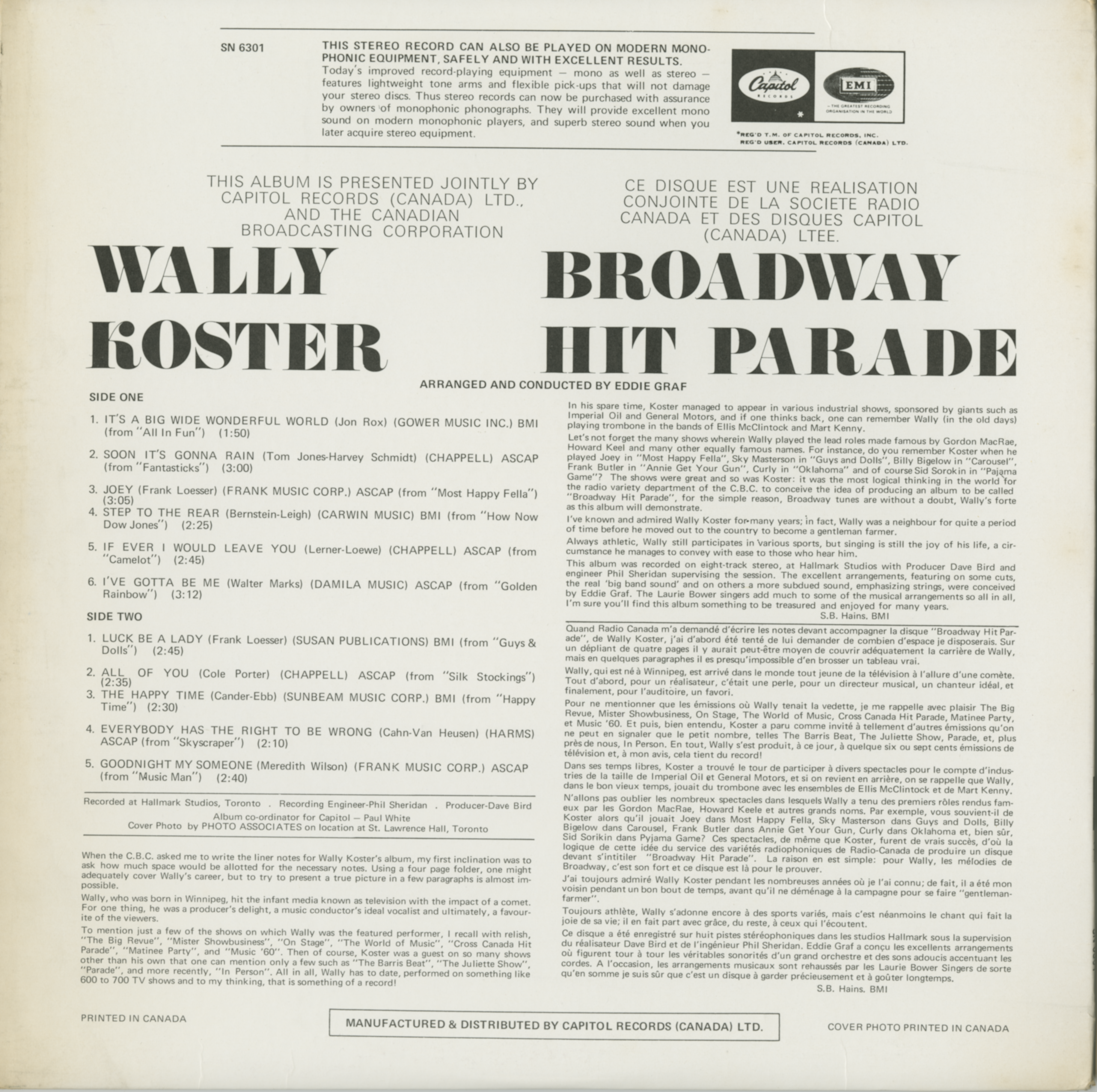 The CBC conceived the idea of producing an album to be called “Broadway Hit Parade” for the simple reason, Broadway tunes are without a doubt, Wally’s forte as this album will demonstrate.