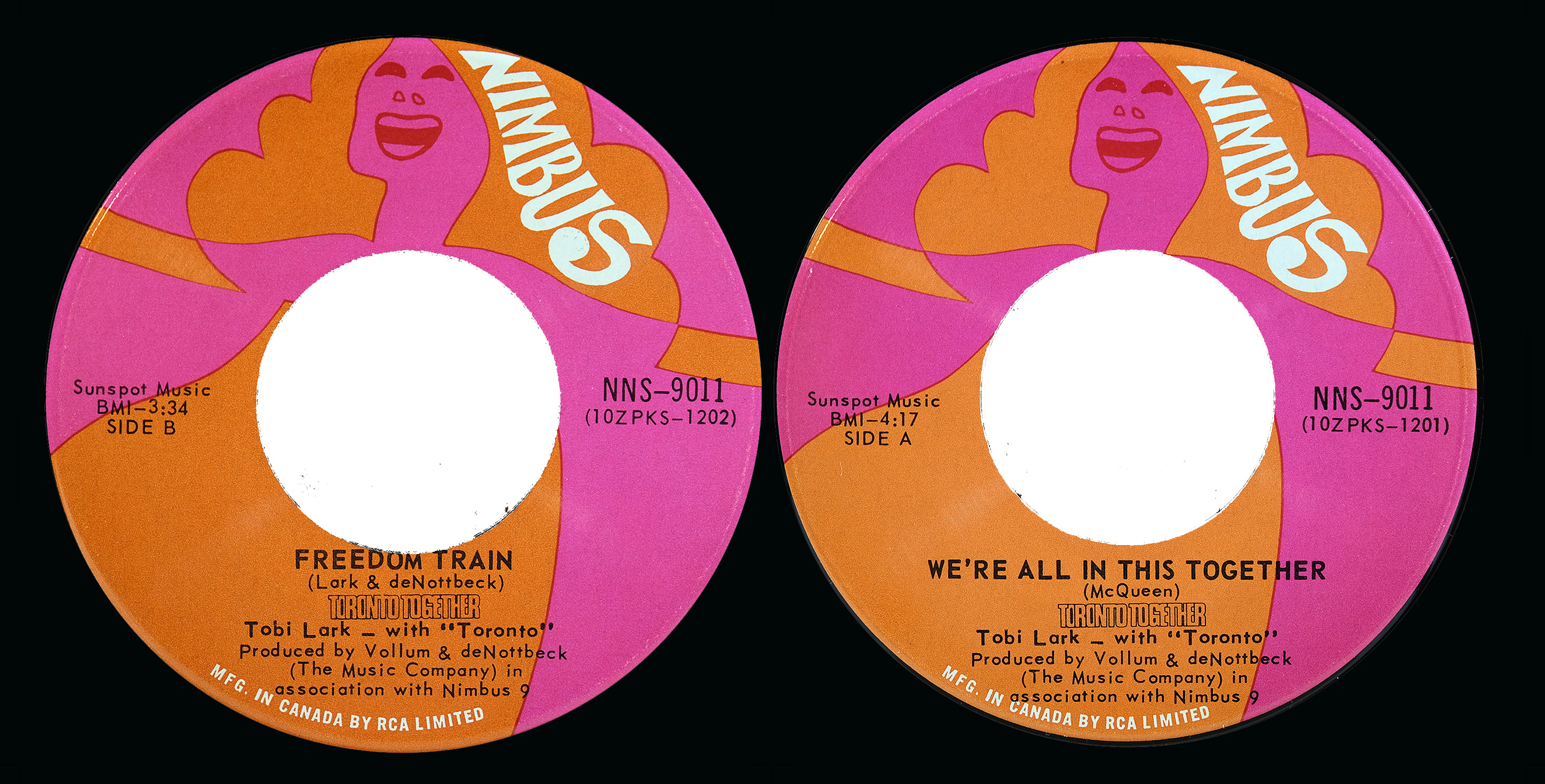 McQueen had already released the song earlier that year with his band Cat, but it had met with little success. Enter Terry Vollum and John De Nottbeck, who were billing themselves as Toronto Together and were looking for a way to cash in on the post-Woodstock vibe. And what better way than by cramming as many people as possible, along with some local musical royalty, to make a record with a universal peace-and-love message. Heading things up would be Tobi Lark, an American transplant who was currently singing one of the leads in the local production of Hair, and Dave Cairns of the fledgling group Leigh Ashford.