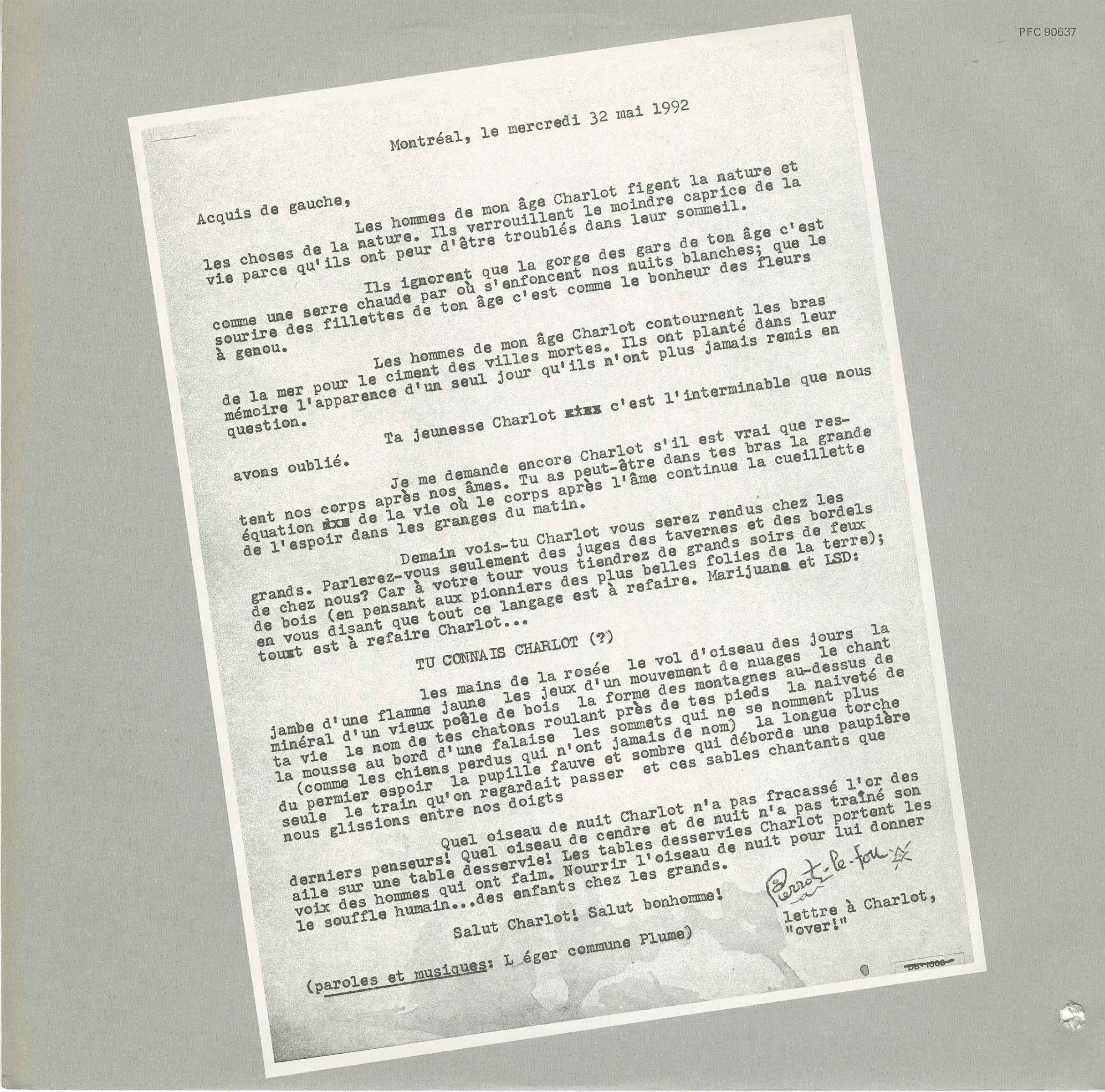 Striking out solo in 1976, Plume quickly established himself as a singular force in the Québécois music scene. Blending blues, folk, Latin, rock ’n’ roll, chanson, and spoken word, his early albums like Plume Pou Digne (1974) and Le Vieux Show Son Sale (1975) became underground landmarks. Songs like “Bobépine,” “Le Mal du pays,” and “Jonquière” struck a nerve with a generation disillusioned by mainstream media and politics. With his tangled beard, raspy delivery, and knack for vivid characters and street poetry, Plume became the voice of the anti-hero: the hitchhiker, the bum, the loner in the tavern who sees through the bullshit.