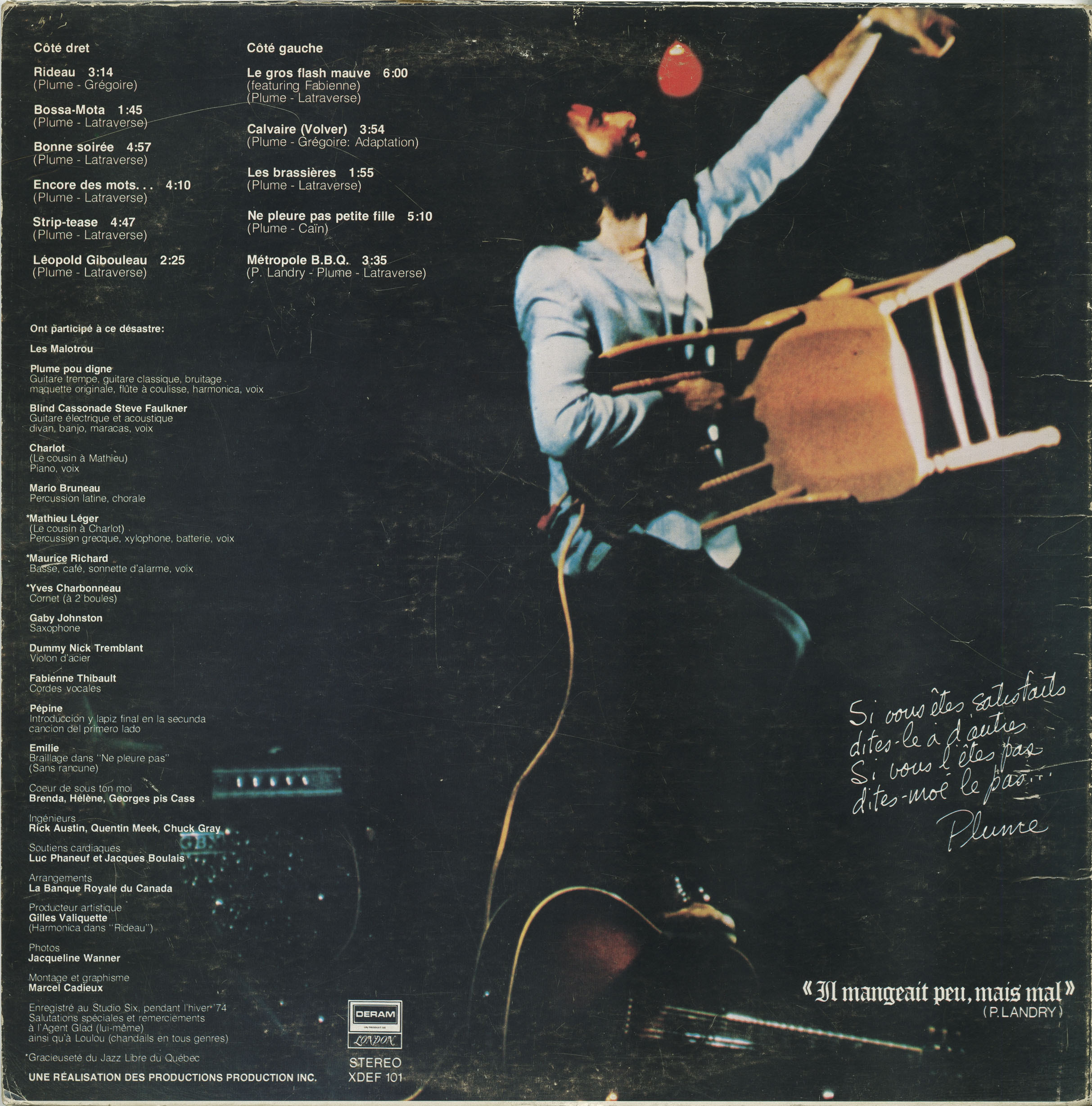 Striking out solo in 1976, Plume quickly established himself as a singular force in the Québécois music scene. Blending blues, folk, Latin, rock ’n’ roll, chanson, and spoken word, his early albums like Plume Pou Digne (1974) and Le Vieux Show Son Sale (1975) became underground landmarks. Songs like “Bobépine,” “Le Mal du pays,” and “Jonquière” struck a nerve with a generation disillusioned by mainstream media and politics. With his tangled beard, raspy delivery, and knack for vivid characters and street poetry, Plume became the voice of the anti-hero: the hitchhiker, the bum, the loner in the tavern who sees through the bullshit.