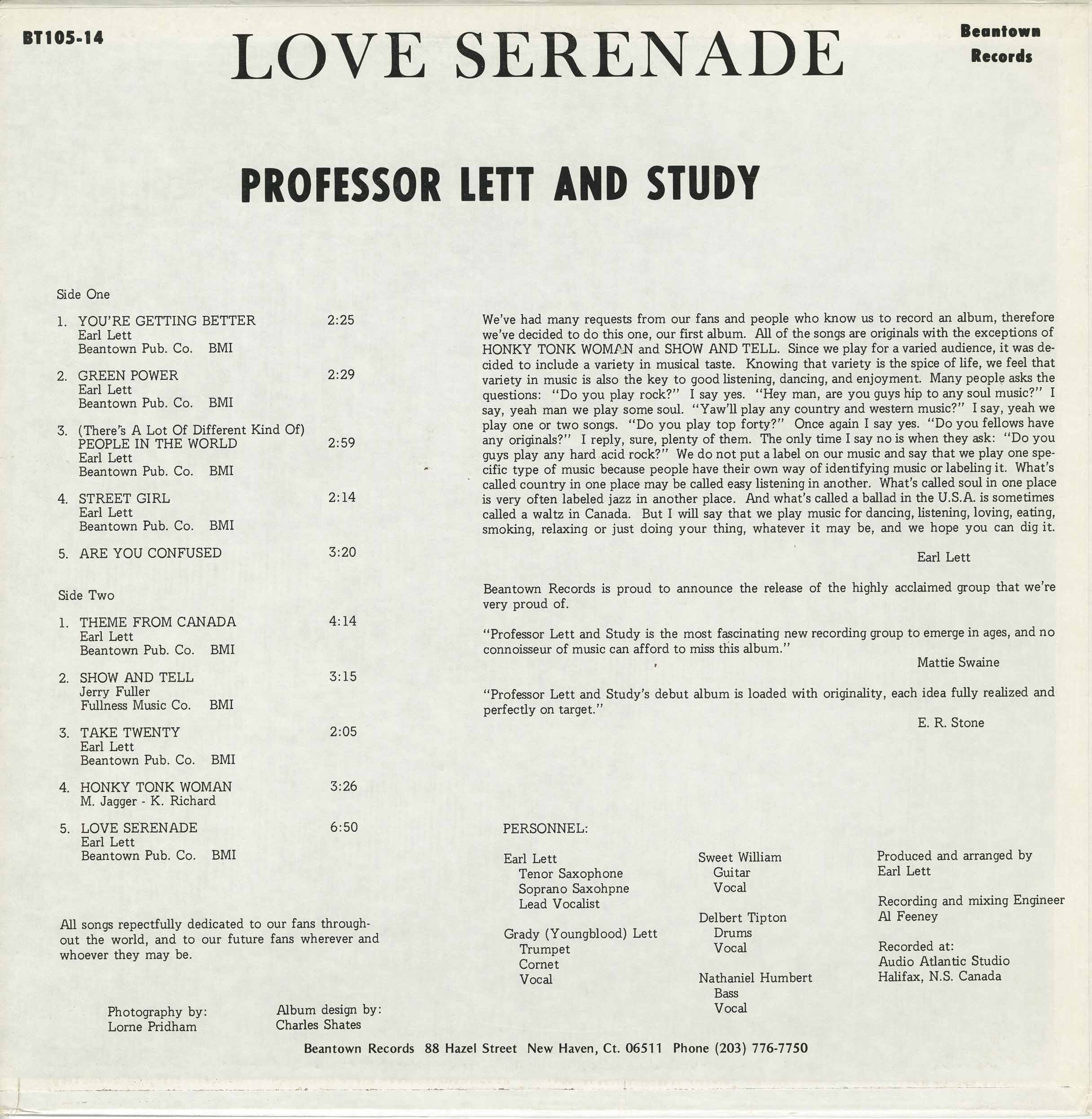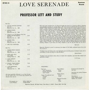 The album Love Serenade features Earl Lett on tenor saxophone, soprano saxophone and lead vocalist; Sweet William on guitar and vocals; Grady (Youngblood) Lett on trumpet, cornet and vocals; Delbert Tipton on drums and vocals; and Nathaniel Humbert on bass and vocals. The album was produced and arranged by Earl Lett. Recording and mixing was by Al Feeney. The photograph was taken by Lorne Pridham. The album design was by Charles Shates.