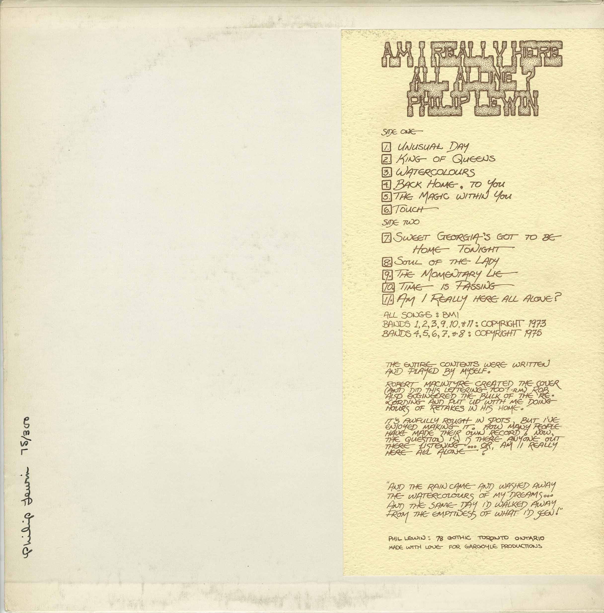 Philip Lewin was an American who grew up in Cortland, New York, USA and moved to the west end of Toronto, Ontario in the early seventies. It was in Toronto where he recorded and released his first of two all original LP’s in the mid seventies. The album “Am I Really Here All Alone” is a distinctive and personal recording of primitive and honest folk music, released on his own label, Gargoyle Records, and pressed at Quality Records, in a press run of 300 signed and numbered copies. Philip wrote the music, sang the songs, and played the rhythm guitar himself.