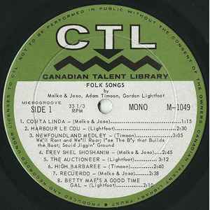 Ontario, 1960's, Folk, Early Lightfoot!, Canadian Talent Library, The Yorkville Sound