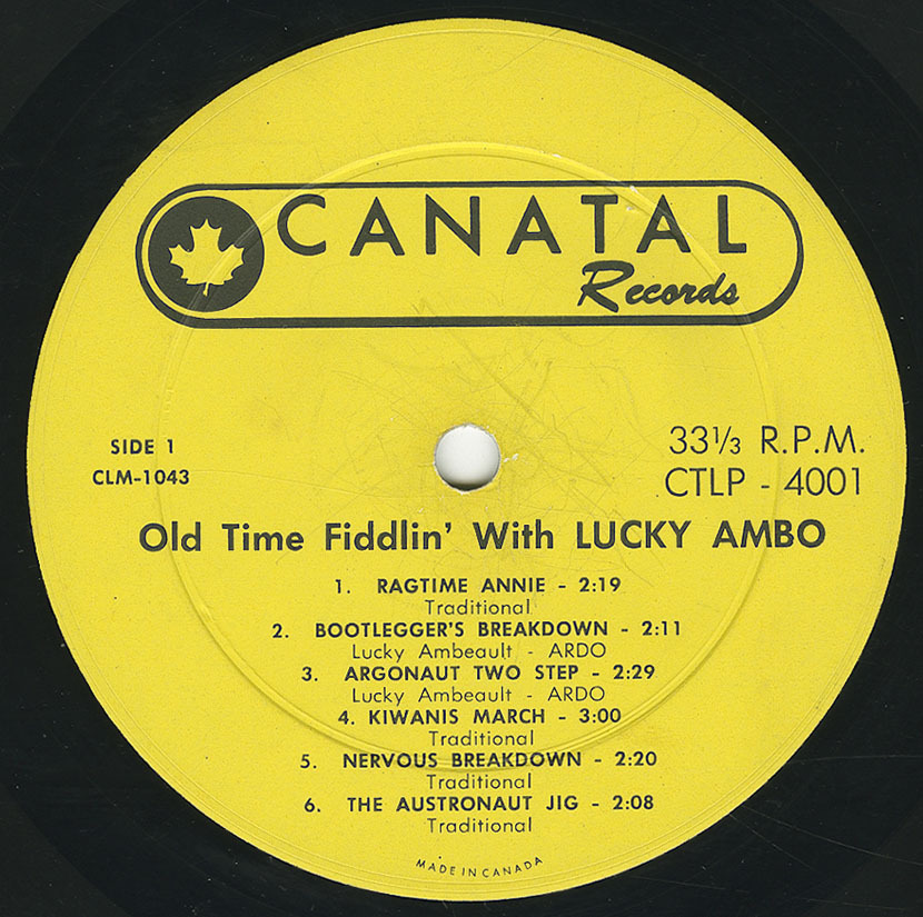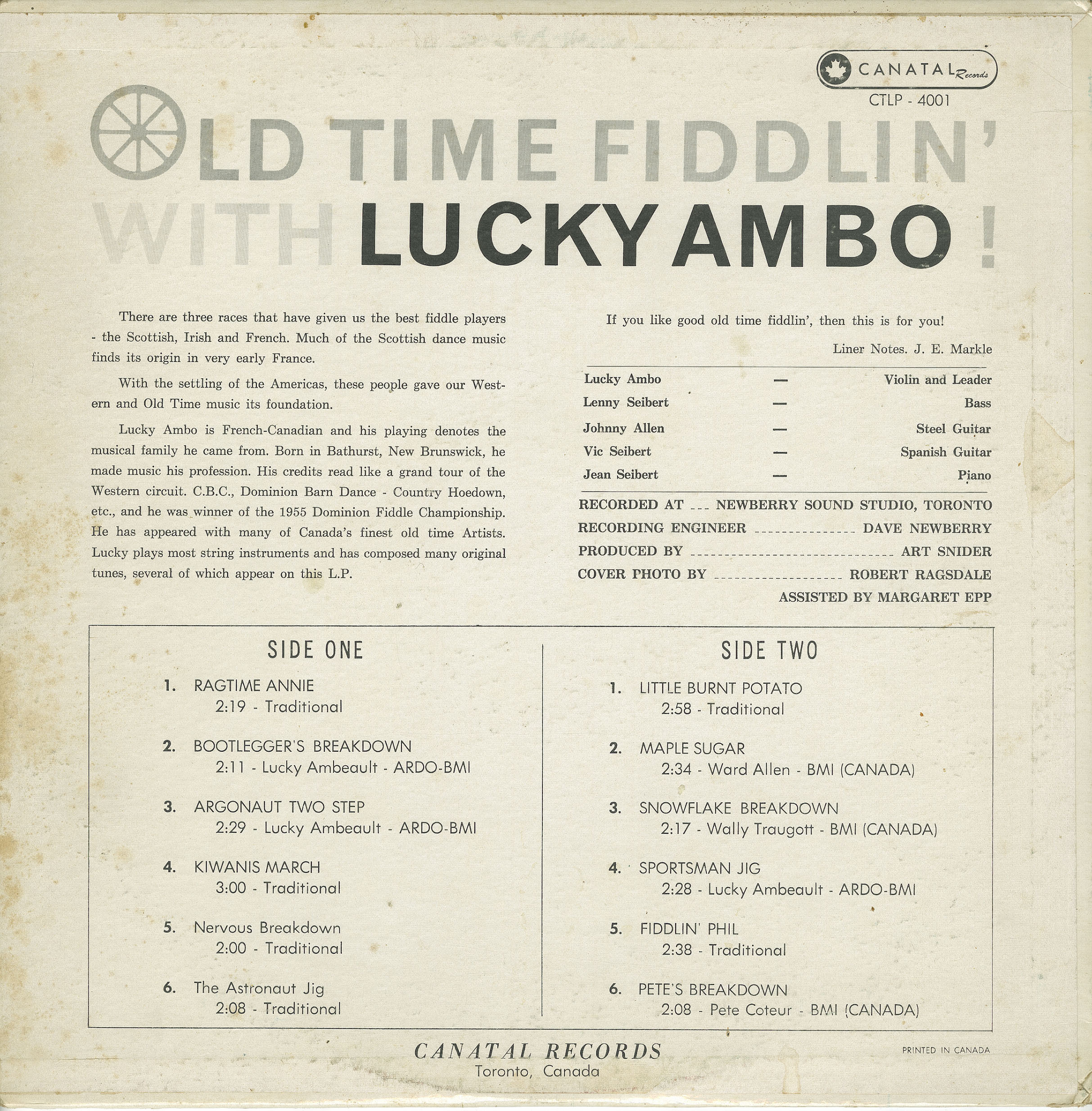 Lucky Ambo (Ambeault) is French-Canadian and his playing denotes the musical family he came from. Born in Bathurst, New Brunswick, he made music his profession. His credits read like a grand tour of the Western circuit. CBC, Dominion Barn Dance, Country Hoedown, etc., and he was winner of the 1955 Dominion Fiddle Championship. He has appeared with many of Canada’s finest old time artists. Lucky plays most string instruments and has composed many original tunes, several of which appear on this LP.
