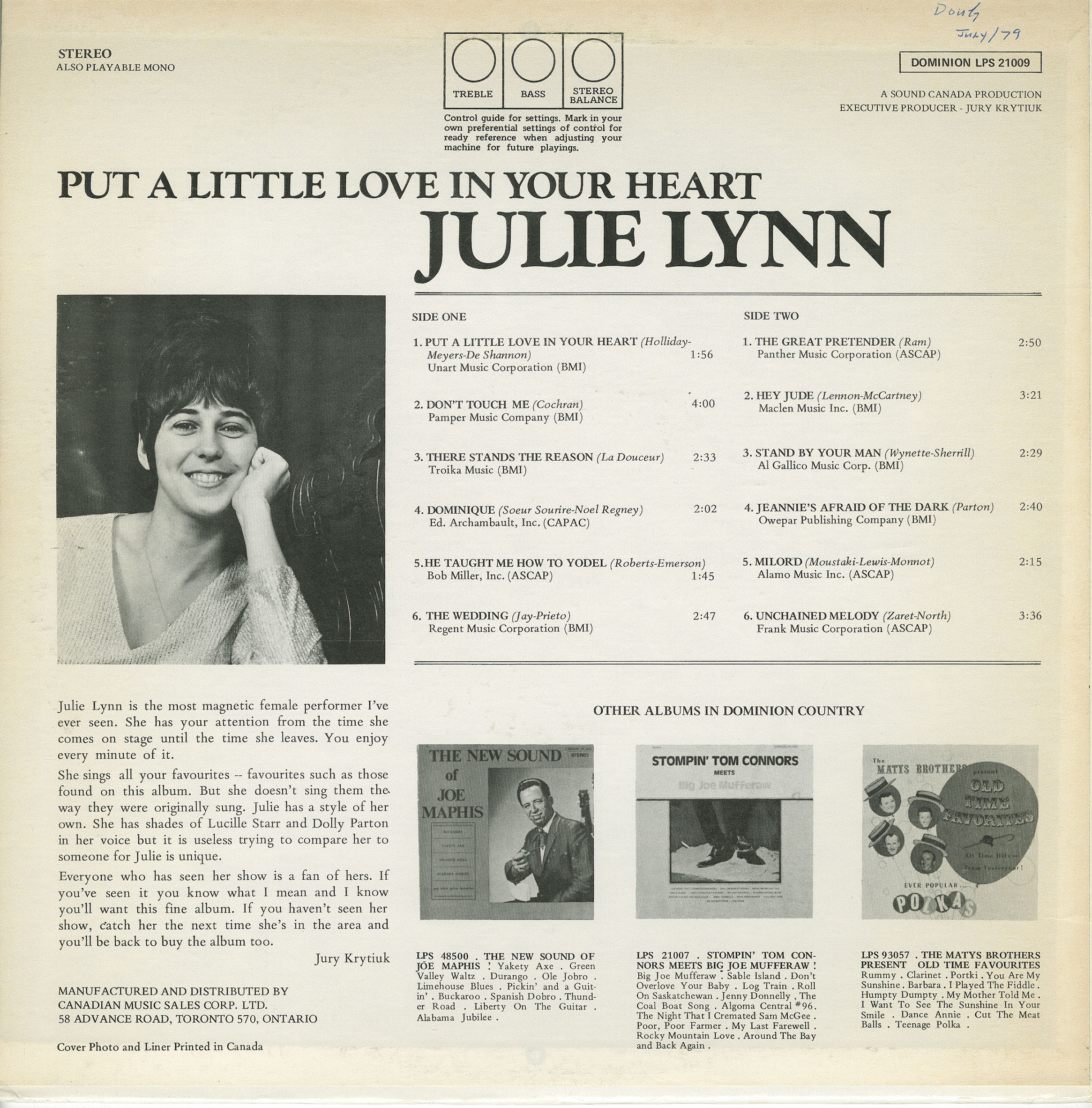 The first female artist inducted into the Ottawa Valley Country Music Hall of Fame, Julie Lynn (born Marie Julia Catherine Flynn, in Gaspe, Quebec, in 1947) got her start playing the bar circuit in northern Ontario as a teenager. After a stint performing with Pauline Noland and her Jamboree Pals - a gig that included a weekly television show on CHOV Pembroke - she formed The Julie Lynn Show in 1966.