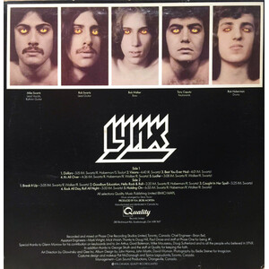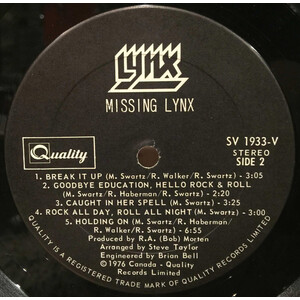 "Missing Lynx" is the debut studio album from Canadian Hard Rock band Lynx. Formed in Toronto by high school friends Mike Swartz and Bob Walker in 1973, they recruited Swartz's younger brother Rob as the second guitarist, and with Walker handling bass, they added Rick Haberman on drums. This album was on the store shelves by that summer, and tracks like the lead-off and first single "Dollars," "Best You Ever Had," "Lucifer" and anthemic "Goodbye Education, Hello Rock & Roll" captured the band's live essence, and word of the band's raucous and flambouyant show continued to spread.