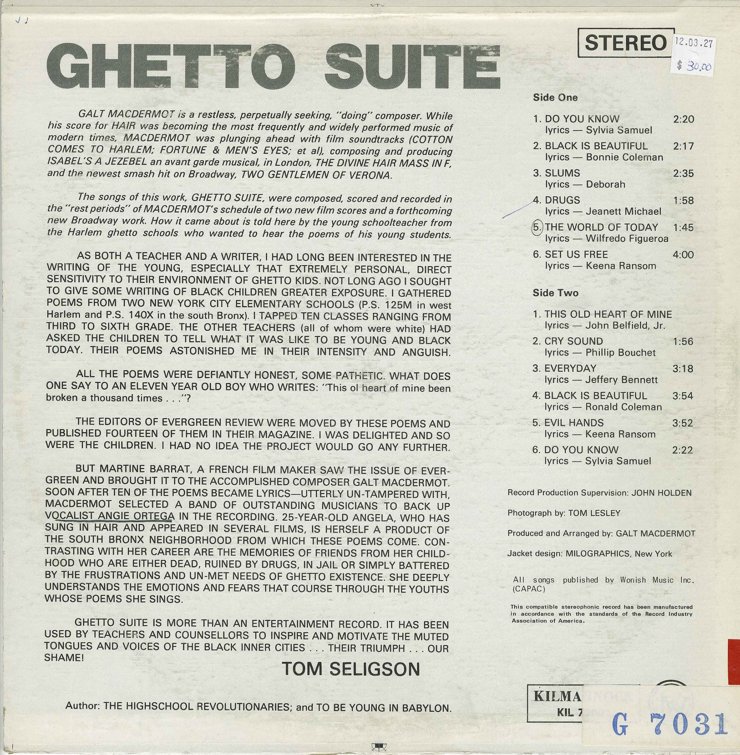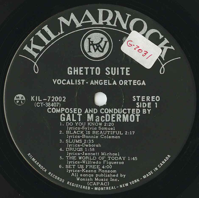 “The songs of this work, Ghetto Suite, were composed, scored and recorded in two weeks. Most of MacDermot’s music came out of new tunes scored for and recorded in the Broadway world. How it came about is told here by the young schoolteacher from the Harlem ghetto schools who unearthed the poems of his young students.”