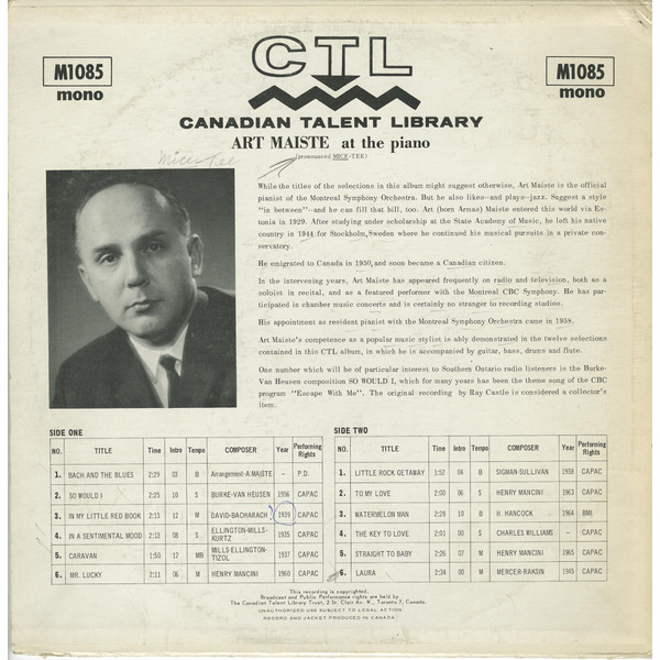 Maiste appeared at the 1971 Montreux Jazz Festival, at the 1973 EBU-sponsored festival in Oslo, and, as a member of the RCI-sponsored ‘All-Star Jazz Sextet,’ at the 1979 Bracknell, North Sea, and Montreux jazz festivals. He taught 1974-83 at McGill University and then took a position at Humber College in Toronto in 1984. He has also taught at the RCMT. His pupils have included the jazz pianists Luc Beaugrand, James Gelfand, Steve Holt, and Dave Restivo. Clearly a musician of remarkable versatility, Maiste has demonstrated his stylistic proficiency and technical assurance on the LPs Bach and the Blues and Pianostyles. For the latter he played in the manner of jazz pianists as diverse as James P. Johnson, Bud Powell, Erroll Garner, and Bill Evans.