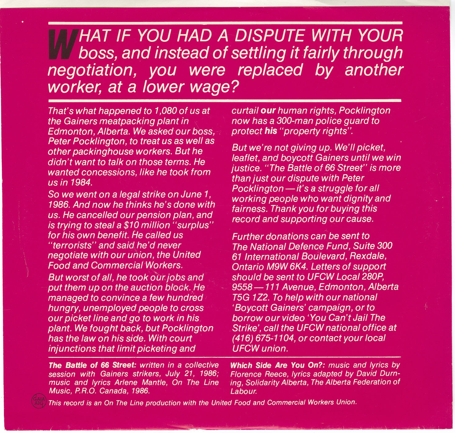 But we’re not giving up. We’ll picket, leaflet, and boycott Gainers until we win justice. The Battle of 66 Street is more than just our dispute with Peter Pocklington — it’s a struggle for all working people who want dignity and fairness. Thank you for buying this record and supporting our cause.
