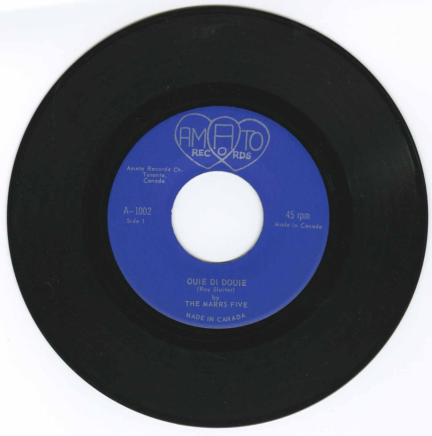 Amato Records was a small independent label in Toronto, known primarily for private-press releases by Benny Spada & The Flames in 1962. Marrs Five sit as an unusual youth-beat entry in that short catalog, illustrating the ad-hoc, community-driven nature of many early Canadian independent labels — someone with access to a pressing plant helping a local group get a single out into the world.