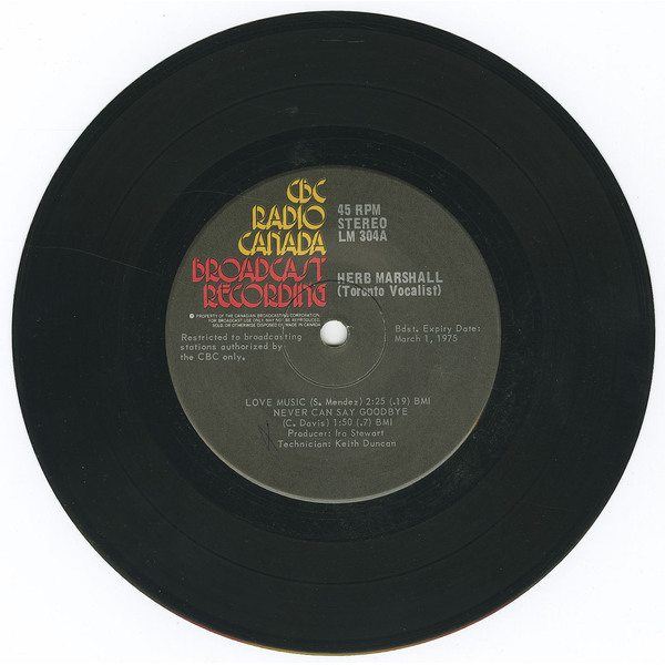 In 1975, Marshall released his only known vinyl recording, a rare 45 RPM titled Toronto Vocalist, produced by Ira Stewart and released by CBC Radio Canada. This record showcased his exceptional talent through soulful renditions of tracks like “Love Music,” “Never Can Say Goodbye,” “Make It With You,” and “Get Out of My Life Woman.” The 45rpm single is a testament to his unique ability to reinterpret contemporary songs with elegance and emotional depth, cementing his legacy as both a gifted vocalist and a versatile performer.