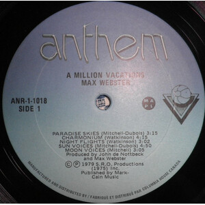 All is silky, ethereal, and crisp as winter snow on Max's most polished piece of studio jewelry, the band's lightest footprinted excursion. A Million Vacations chimes clear as a bell, the album lovingly layered with keyboards, buoyant with bright guitars and lush, letter-perfect harmonies. Highlight of the collection comes with what proved to be the band's biggest hit Paradise Skies, a masterwerk of dynamics and uncompromising professionalism with one of the most gushingly enjoyable drum sounds ever plucked from, then tweaked for, the airwaves. Other aural sculptures that spot and dot Max's moving target of offbeat inversion include the whacked-out Rascal Houdi, the live and unkempt Research (At Beach Resorts), the spring water-pure Charmonium, and last but not least, the good feeling boogie rockin' title track. The sounds on this truly awesome head trip simply ebb and flow as if the band were wrapped in a dream, all the while firmly rooted in an earthly and knowing pride in its obvious accomplishment, creating high upon high, working with a shared love of quality craftsmanship, eye askance to big brothers Rush for professional guidance. The final result is evident within the grooves, rhythms which just sing with enthusiasm, no small thanks to the album's state-of-the-art Maxmix. As history would have it, A Million Vacations is largely considered Max Webster's quintessential, defining work, most likely due to its maturity, accessibility, and seemingly elliptical but somehow comfortable cohesion, not to mention the (Canuck) hit status of no less than four songs: Paradise Skies, copasetic pop hummer Let Go The Line, airy prog masterpiece Night Flights, and to a lesser extent the title track. But to my mind, putting side such base and shackling commercial concerns, the record is merely yet another masterpiece comprising a body of work that baffles, elates, provokes and charmingly, good-naturedly pokes fun.