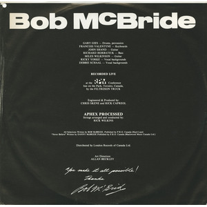 After several years of limited activity, McBride signed with MCA Records and released his third solo album, Here to Sing (1978), featuring arrangements by Paul Hoffert and production by Jack Richardson. Despite strong musicianship” the album failed to chart. He followed it with a self-titled live album, Bob McBride (1979), recorded at the RPM Conference at Toronto’s Inn on the Park and released on Aurora Meadows Productions.