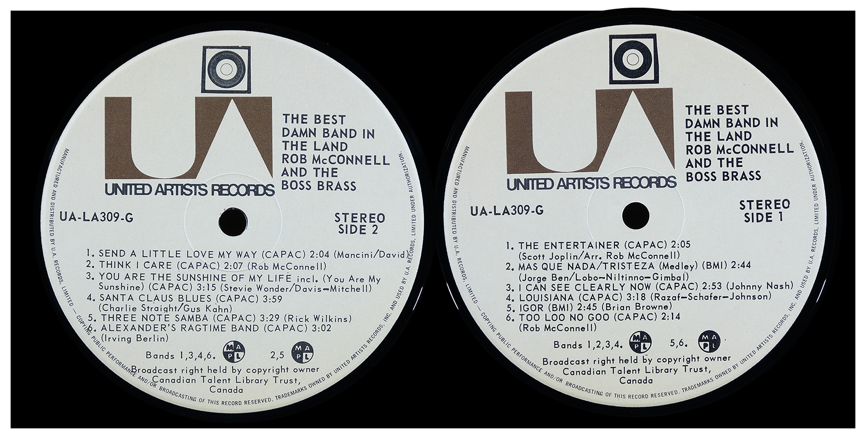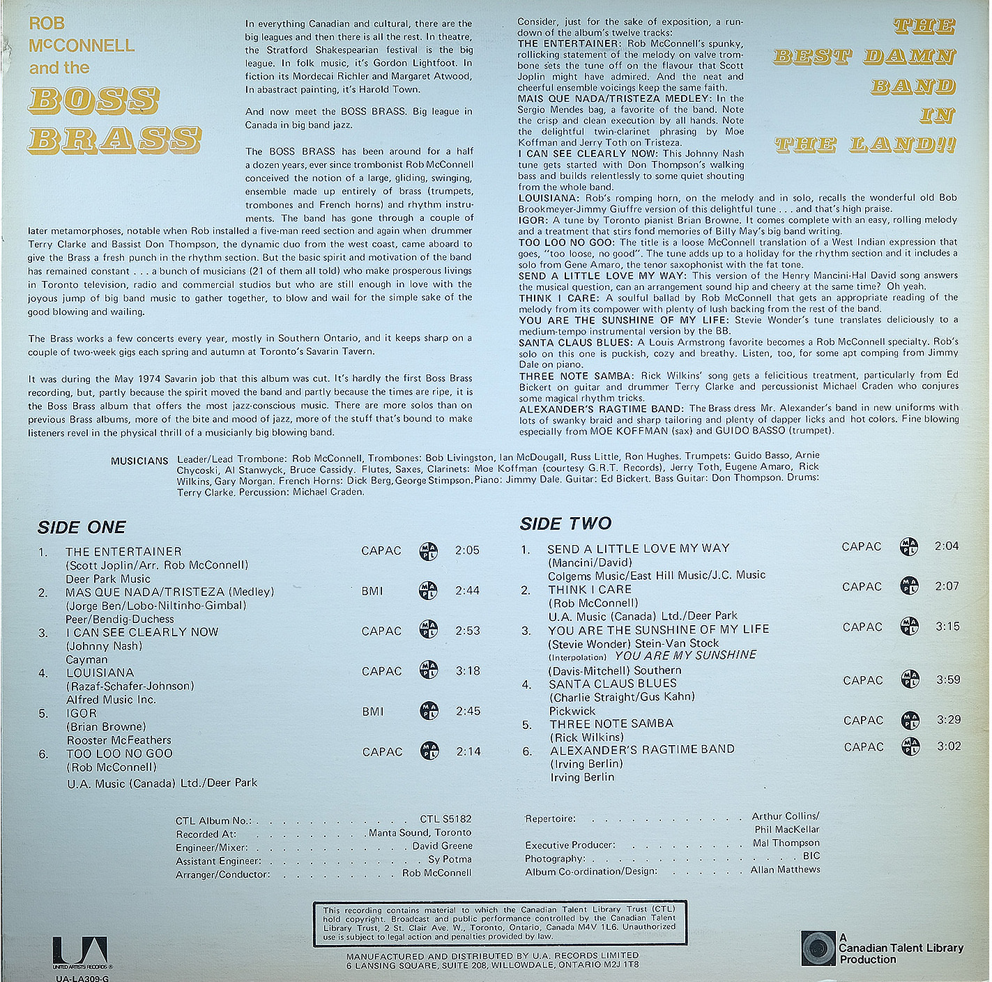 That vision became reality in 1968 with the birth of The Boss Brass, a sixteen-piece ensemble of Toronto’s finest studio musicians. The group’s sound was bold and unmistakable: four trumpets, four trombones, a pair of French horns, and a rhythm section, with no saxophones at first. In 1970 McConnell added a full woodwind section, and by 1976 the band had grown to twenty-two members. The result was a powerhouse outfit that set a new standard for big band music in Canada.