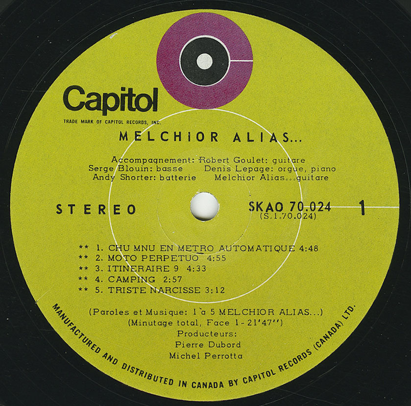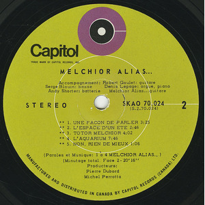 This French-Canadian ultra-rarity makes its long-overdue CD debut here. Originally issued in 1969, it's a crazed blend of catchy pop, funky grooves and spaced-out psychedelia, with plenty of acid guitar. The identity of the enigmatic Melchior Alias remains unknown, but numerous leading lights of Quebec's progressive music scene are involved, including arranger and future disco luminary Denis Lepage and engineer Peter Tessier (later to make his own rare album). It seems likely that the credit for Robert Goulet as musical director is a joke -- but anything seems possible on this most strange and mysterious of discs. "From Quebec and sung in French, this goofy fusion of guitar, organ, drums and mild electronics has an amiable air of stoned experimentalism ... the highlights are the bizarre groover 'Itineraire 9,' laid-back ballad 'L'Espace d'un Été' and spacey 'L'Aquarium,' which recall the more experimental work of Michel Polnareff and Serge Gainsbourg. Two 45s were extracted, and quite a lot of effort went into the packaging, but promotion and distribution must have been poor, as it's easily one of the rarest major label albums of the period."
