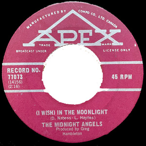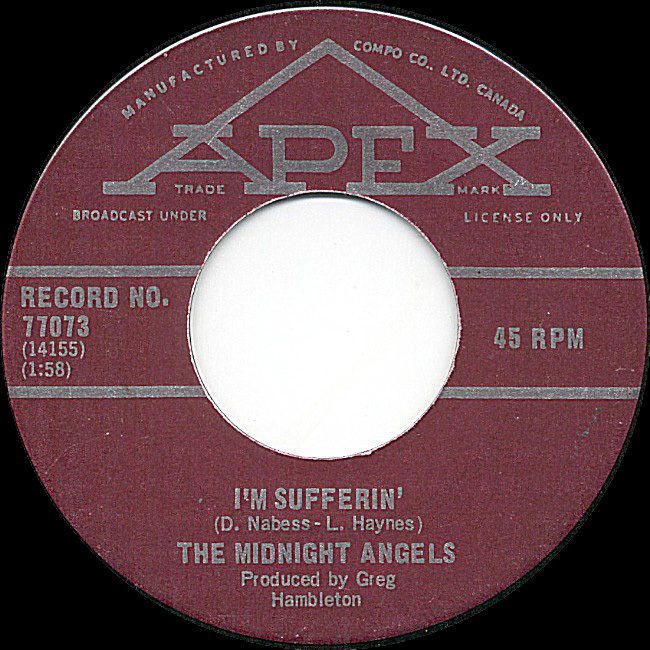From The Pas, Manitoba, the 60’s rockabilly band The Midnight Angels are featured here with four rare tracks. The original musicians on the recording sessions at Toronto’s Sound Canada Recording Centre in 1967 are Lary Haynes, vocals and bass; Don Nabess, rhythmn guitar and vocals; Charles Nabess, lead guitar and vocals with Jim Moran on drums. After the session, Bill Allard replaced Jim on drums when they toured. Their first single was “I’m Sufferin’” b/w “(I Wish) In The Moonlight” released on the Apex label in early 1969 with local success in Dauphin (#4 on CKDN), Winnipeg and throughout the Western provinces where they toured.