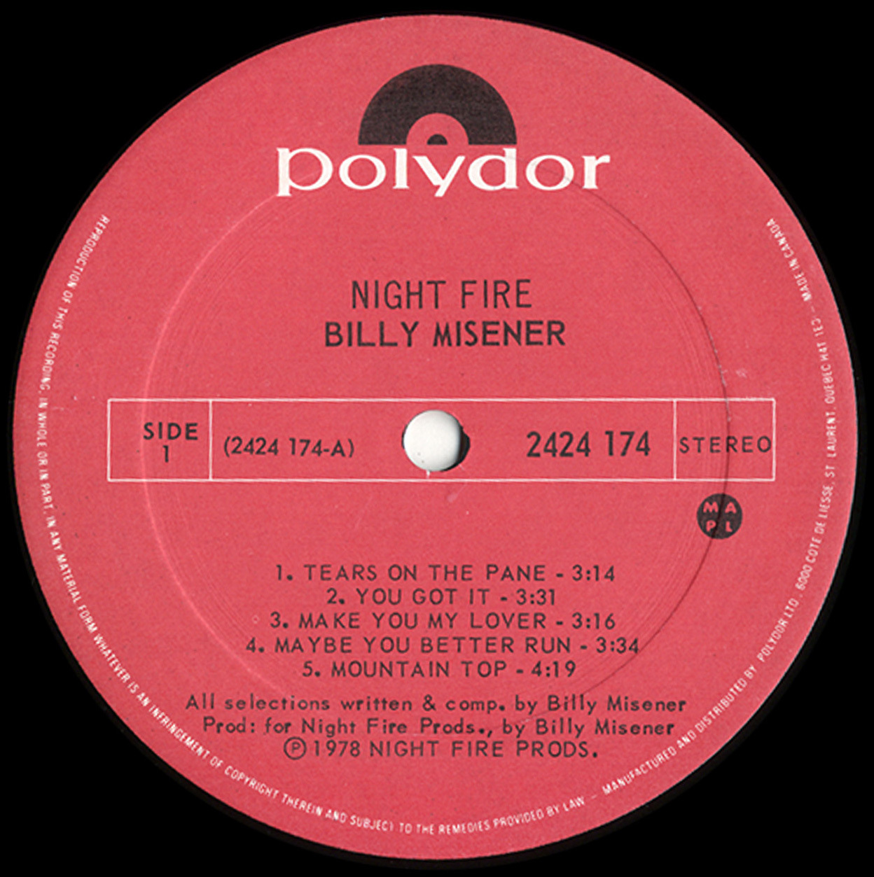 His most complete artistic statement came in 1978 with Night Fire, issued under the name Billy Misener by Polydor Canada. Blending smooth rock, soul-tinged balladry, and polished adult contemporary pop, the album featured standout tracks like “Maybe You Better Run,” which charted on CHUM FM’s playlist. Though not a blockbuster, the album was critically well-regarded and has since gained cult status among collectors of 1970s Canadian AOR and soft rock.