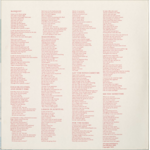 "Lesson in Survival" is the first of the love songs, about the restlessness of what's new, the longing for sensation, the more pastoral the better. It hurts, this song, because she is capable of delivering such a strong subliminal suggestion and the pulse of her desire is so irresistible. It's so pretty and true it makes me want to jump out of my skin. She says it of herself—"When you dig down deep/You lose good sleep/And it makes you heavy company." "Lesson" segues by way of the piano into "Let the Wind Carry Me." With a choral and woodwind flavor it's about family chemistry, parental consent, content and displeasure. Talk about heavy company, try your parents!