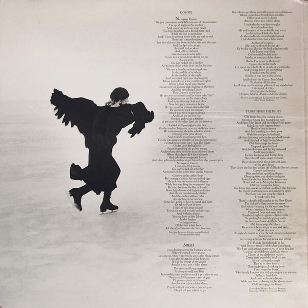Hejira’s tenor is one of personal reconstitution, but Mitchell populates the lyrics with characters she met along the way, some literal, some symbolic, each representing a fundamental component of her character. “Furry Sings the Blues” describes her actual visit with the bluesman Furry Lewis near Memphis’ crumbling Beale Street, one birthplace of the blues, and could be an allegory for the corruption of a music business that left its pioneers behind, another parking lot paved over paradise. (That’s Neil Young on harmonica.) “A Strange Boy” recounts her disappointing tryst with her travel companion and his confounding immaturity, standing in for the overall inadequacy of men that Mitchell had contended with so often. It’s attuned to mystery, representing this guy she couldn’t crack in amazing dialogue, like, “He asked me to be patient/Well I failed/‘Grow up!’ I cried/And as the smoke was clearing, he said/‘Give me one good reason why.’” On the discordant “Black Crow,” Mitchell likens herself to the bird overhead, brooding, searching, diving. But the most powerful of these itinerant encounters occurs solely in her imagination.