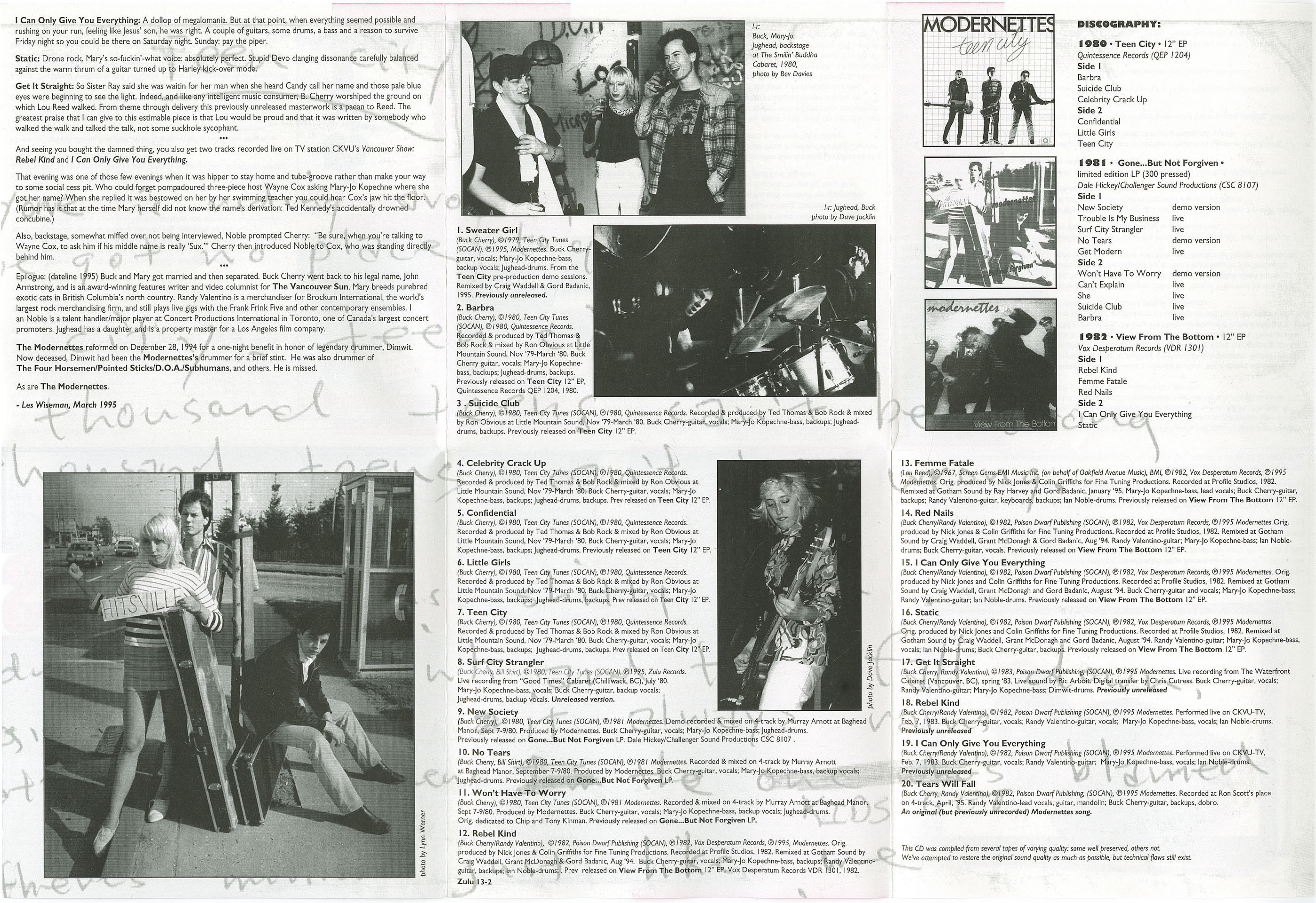 Forming in 1980, The Modernettes were a Canadian punk band from Vancouver. The band were a three piece, John "Buck Cherry" Armstrong was on guitar/vocals, Mary Jo Kopechne covered bass/vocals, and John "Jughead" McAdams played drums and sang as well. The band has been described commonly by critics as a mix between The Velvets and Ramones. The band had a sound that was a mix of pop and punk way before the days of modern pop-punk bands such as Sum 41; the band also was influenced by other bands, like The Who. The band was not like other Canadian punk acts like D.O.A. or The Subhumans, they were different.