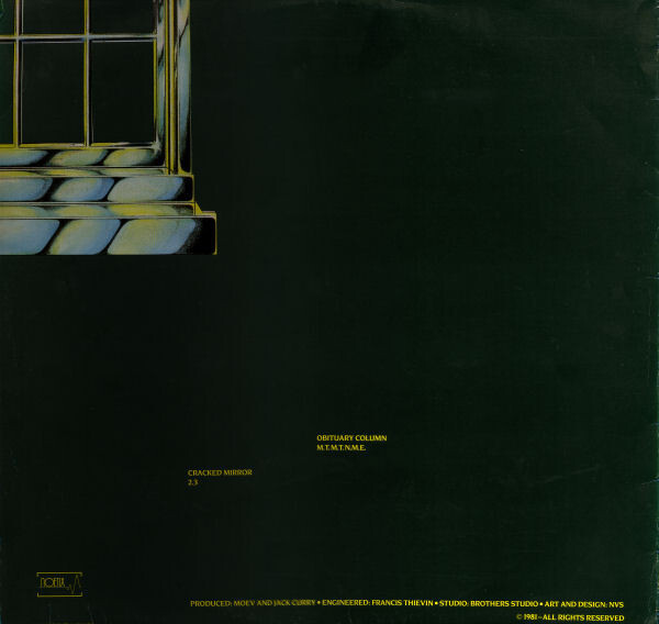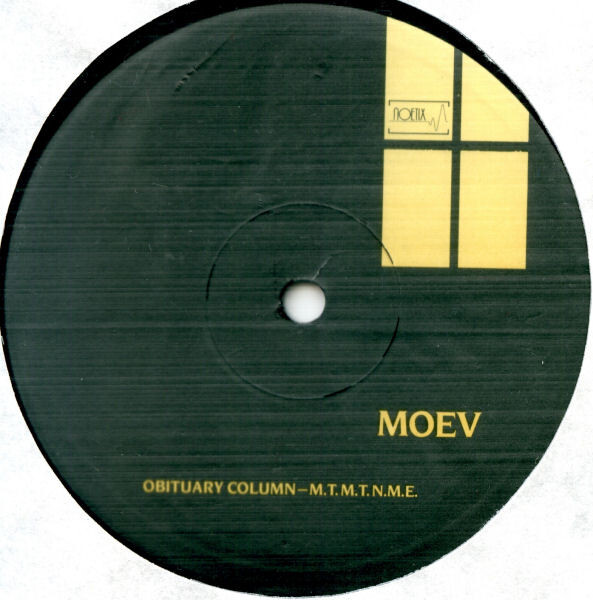 No catalogue number on cover or vinyl. Only distributed in the westcoast-area of Canada in a very limited edition. The versions of "Cracked Mirror" and "M.T. M.T. N.M.E." differ from those released on the 'Rotting Geraniums' 12" and the 'Zimmerkampf' LP. Profile: Moev is a synth-pop band based in Vancouver, Canada. It was founded in 1981 by Tom Ferris (keyboards, percussion) and Cal Stephenson (keyboards, vocals). They were joined by Madeleine Morris (vocals) and Mark Jowett (guitar) later that year. Moev's debut album, "Zimmerkampf," appeared in 1982. After their first label (San Francisco based "Go! Records") went broke in early 1983, band member Mark Jowett and manager Terry McBride formed Nettwerk Records in early 1984 to release Moev material. Singer Madeleine Morris departed, leaving Cal Stephenson to fill in temporarily. Christine Jones was recruited to provide vocals for the 1984 singles "Toulyev" and "Alibis." In January 1985 Michella Arrichiello became the new vocalist in collaboration with Cal. After signing with Profile Records of New York in September 1985, "Dusk And Desire" was released. At this point, Mark Jowett left to concentrate on his managerial duties at Nettwerk, Cal Stephenson returned to school, and Michella Arrichiello left as well.... A new lineup for Moev would take shape: joining Tom Ferris were Kelly Cook (bass, drums, vocals), Dean Russell (vocals) and Anthony Valcic (keyboards, percussion) (briefly). Two successful 12" singles followed, "Wanting" and "Capital Heaven," and Moev were picked up by Atlantic Records for the next album "Yeah Whatever". In early 1990, Moev began recording with producer John Fryer on their third album "Head Down," with Sarah McLachlan providing background vocals. The release of the 1991 compilation album "Obituary Column" appeared to be Moev's last. Singer Dean Russell passed away in 1994 after a lengthy illness. Tom Ferris worked in various other projects until 1998, when he and Julie, his wife and new vocalist, decided to re-animate the band, recording songs they had written in the intervening years. Founding member Cal Stephenson co-wrote some songs. Kelly Cook re-joined the band. Finally Drew Maxwell (guitar player for Redshift) was added to the lineup. Perhaps there is more in store from Moev.... Members: Anthony Valcic, Cal Stephenson, Dean Russell, Drew Maxwell, Julie Ferris, Kelly Cook, Madeleine Morris, Mark Jowett, Michael Balch, Michela Arrichiello, Tom Ferris