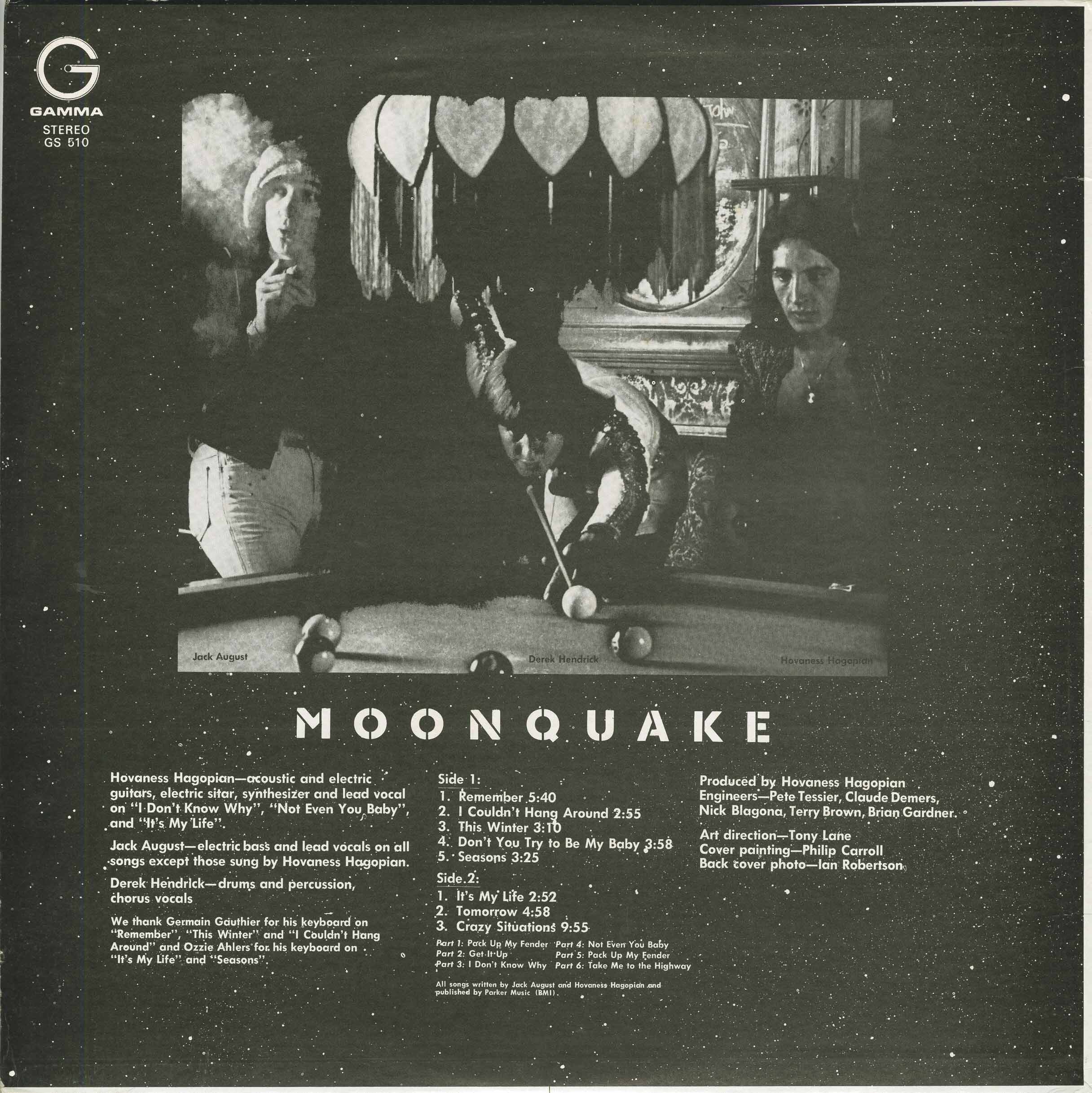 The following year they rebranded as Moonquake, keeping “Remember” and “This Winter” as centerpiece tracks for their self-titled debut LP on Gamma Records. Blending heavy rock riffing with flashes of psychedelia and even country-rock, the album showcased August’s gritty lead vocals alongside Hagopian’s multi-instrumental range, which included electric sitar and synthesizer. Kendrick anchored the sound with dynamic percussion, while guest keyboardists Germain Gauthier and Ozzie Miles added further depth. The record drew critical praise: Ottawa Citizen writer Bill Provick heard echoes of the Yardbirds and Lennon/McCartney in Moonquake’s songs, calling the LP “the finest debut album I’ve heard in some time.” “Remember” received steady radio play and remains their most enduring track.