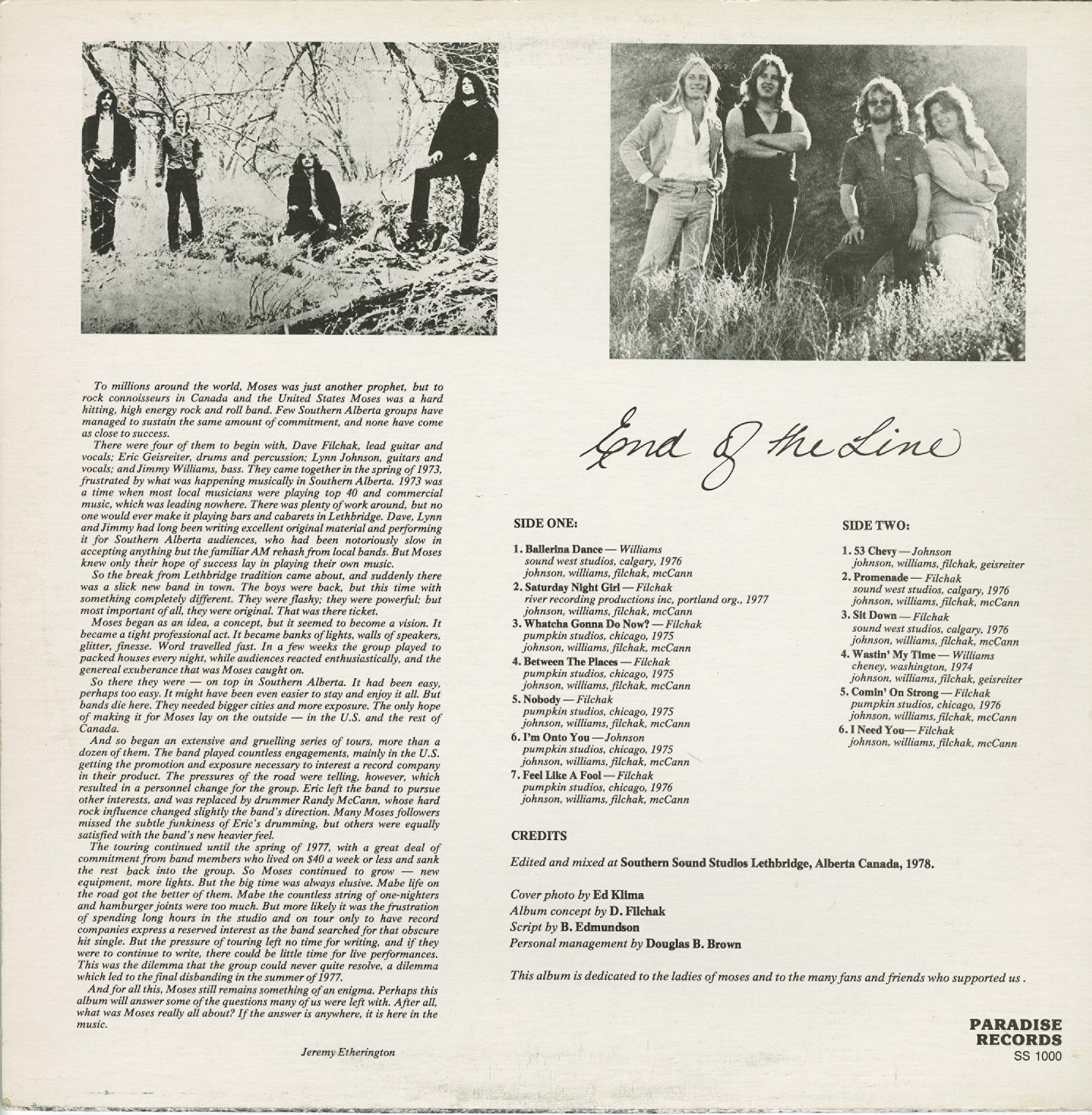 Dave Filchak and Robert Williston present Moses - End of the Line - an outstanding album and one of the best rock albums from Alberta in the 1970's. I originally uploaded a few tracks on itcamefromcanada.com way back on December 20, 2009. This updated version contains 11 of the 13 tracks remastered from Dave - and two from my most recent vinyl transfer ('Ballerina Dance' and 'Feel Like a Fool' as they have better sound than the original master tapes.