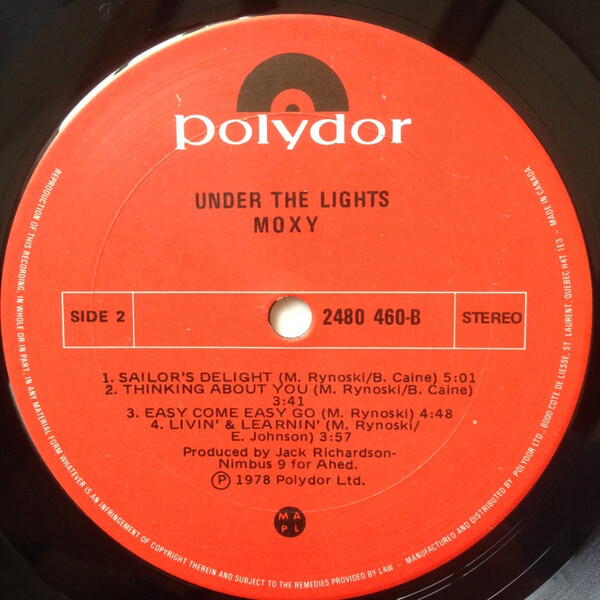 With the departure of Buzz Shearman from Moxy in 1977 for medical reasons, Mike Rynosky (Reno) was brought in as lead vocalist. In 1978, the first album with Reno, entitled Under the Lights, was released. This album saw a more laid-back style in the sound of Moxy with a strong concentration on a blues styling rather than hard rock. The vocal work of Reno was not as strong or dynamic as Shearman's and the entire album lacked the punch of the band's earlier works. Under the Lights was the last album of original material released by the band with exception of a hits compilation in the '80s . In 1983, Buzz Shearman died as a result of a motorcycle accident and a tribute album featuring some of his best songs with Moxy was released in the late '90s. This release of Under the Lights by Unidisc is a straight reissue of the original Mercury/ Polydor Records album at a budget price complete with original artwork but, unfortunately, it contains no bonus tracks. In 2000, Moxy re-formed with new vocalist Brian Maxim and released the album Moxy V for Pacemaker Records.
