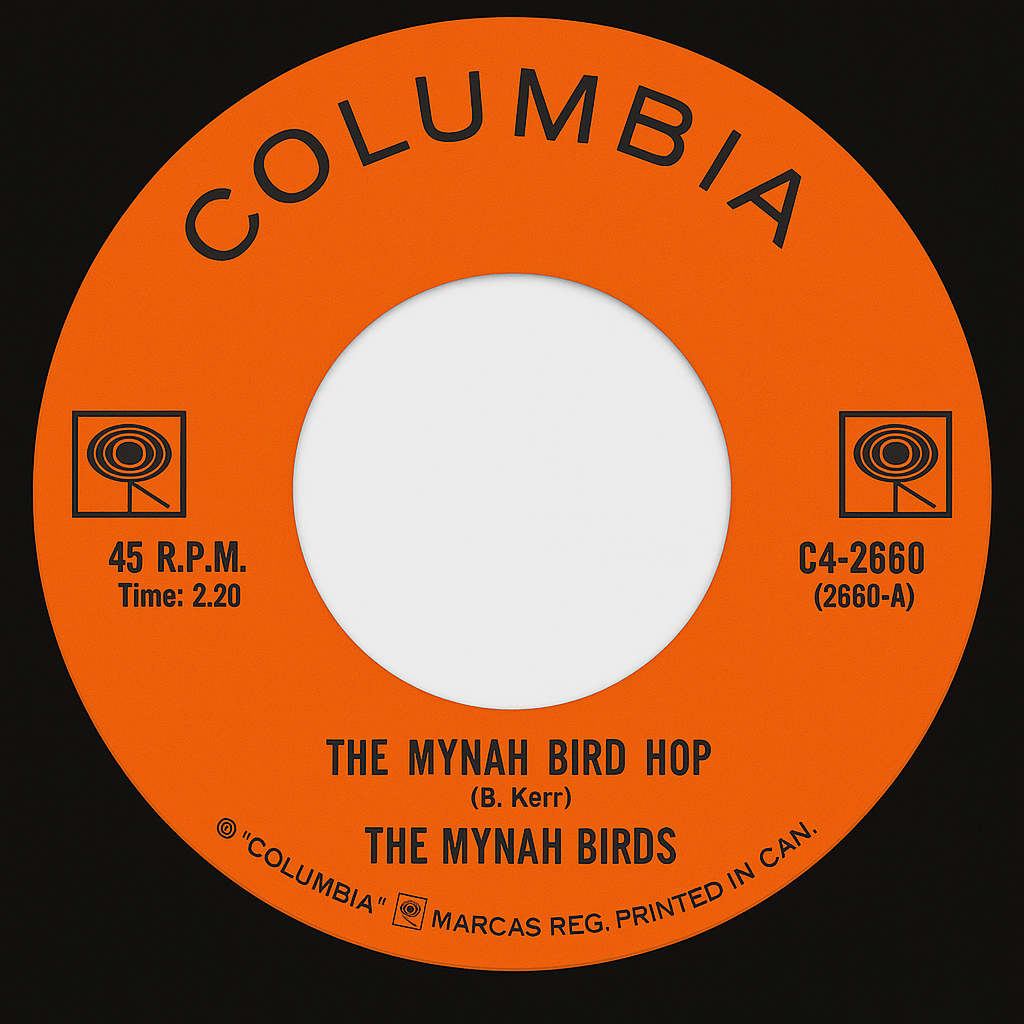 Under Kerr’s guidance, the group recorded their first Canadian single in early 1965 for Columbia Records: “The Mynah Bird Hop” backed with “The Mynah Bird Song” (C4-2660). Written by Kerr’s brother Ben Kerr, the record featured Jimmy Livingston (vocals), Frank Arnel (guitar), and Goldy McJohn (organ), and included contributions from several players who floated in and out of the lineup. Though a commercial failure, it marked Rick James’s first official studio release.