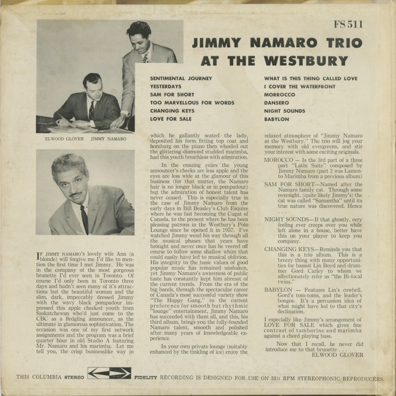 Parallel to his broadcast career, Namaro became a fixture of the nightclub circuit. Nowhere was this more evident than at Toronto’s Westbury Hotel, where he led trios and ensembles in the Polo Lounge for extended engagements beginning in the 1950s. Liner notes from albums recorded at the Westbury reveal a musician who moved fluidly between piano, vibraphone, and marimba, shaping programs that balanced standards, original compositions, Latin material, and contemporary jazz. These were not casual lounge gigs but tightly organized musical environments, often featuring the same core personnel over many years, reinforcing Namaro’s preference for continuity and ensemble cohesion.