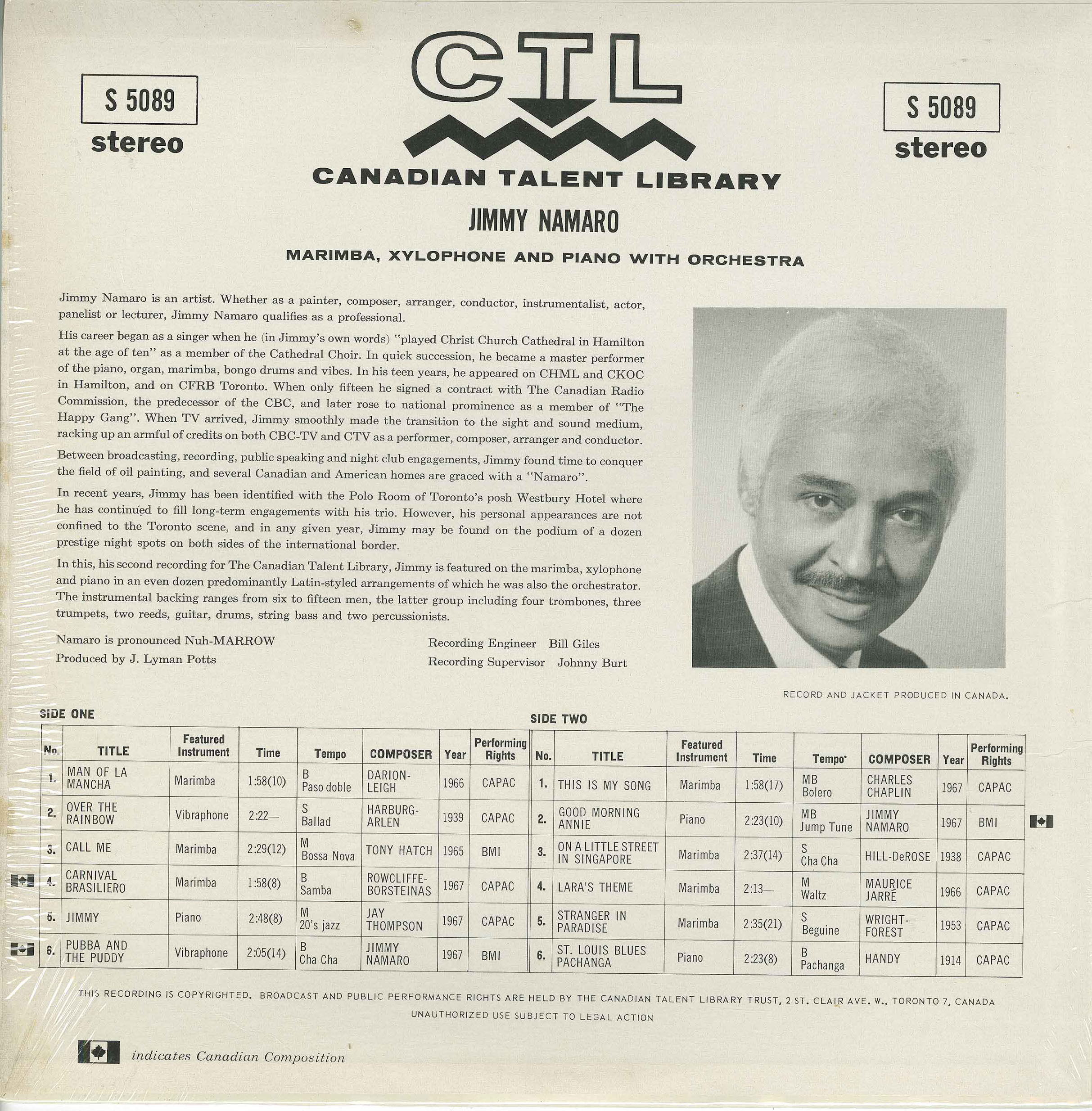Namaro was also a prolific composer and arranger, writing original material for his albums, countless commercial jingles, and music for CBC radio and television drama, including the series Seaway. His compositional voice favored melody and rhythm over abstraction, a trait echoed in his own liner notes, where he repeatedly emphasized accessibility, groove, and emotional clarity. Beyond music, Namaro was an accomplished painter, working in a primitive style and exhibiting his artwork publicly — another expression of the same instinct to communicate directly rather than intellectually.