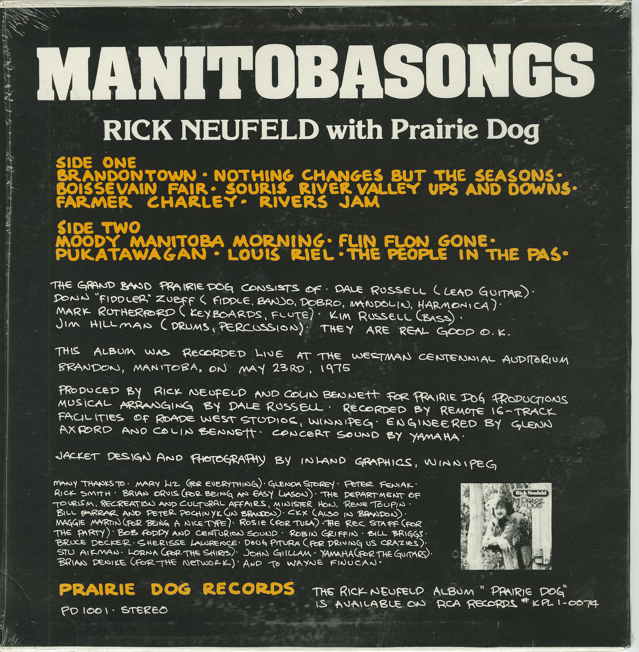 Privately issued on Prairie Dog Records, ManitobaSongs documents Rick Neufeld performing his Manitoba-centred repertoire in a live concert setting with a regionally based ensemble. The album preserves definitive performances of songs closely associated with Manitoba history, geography, and community life.