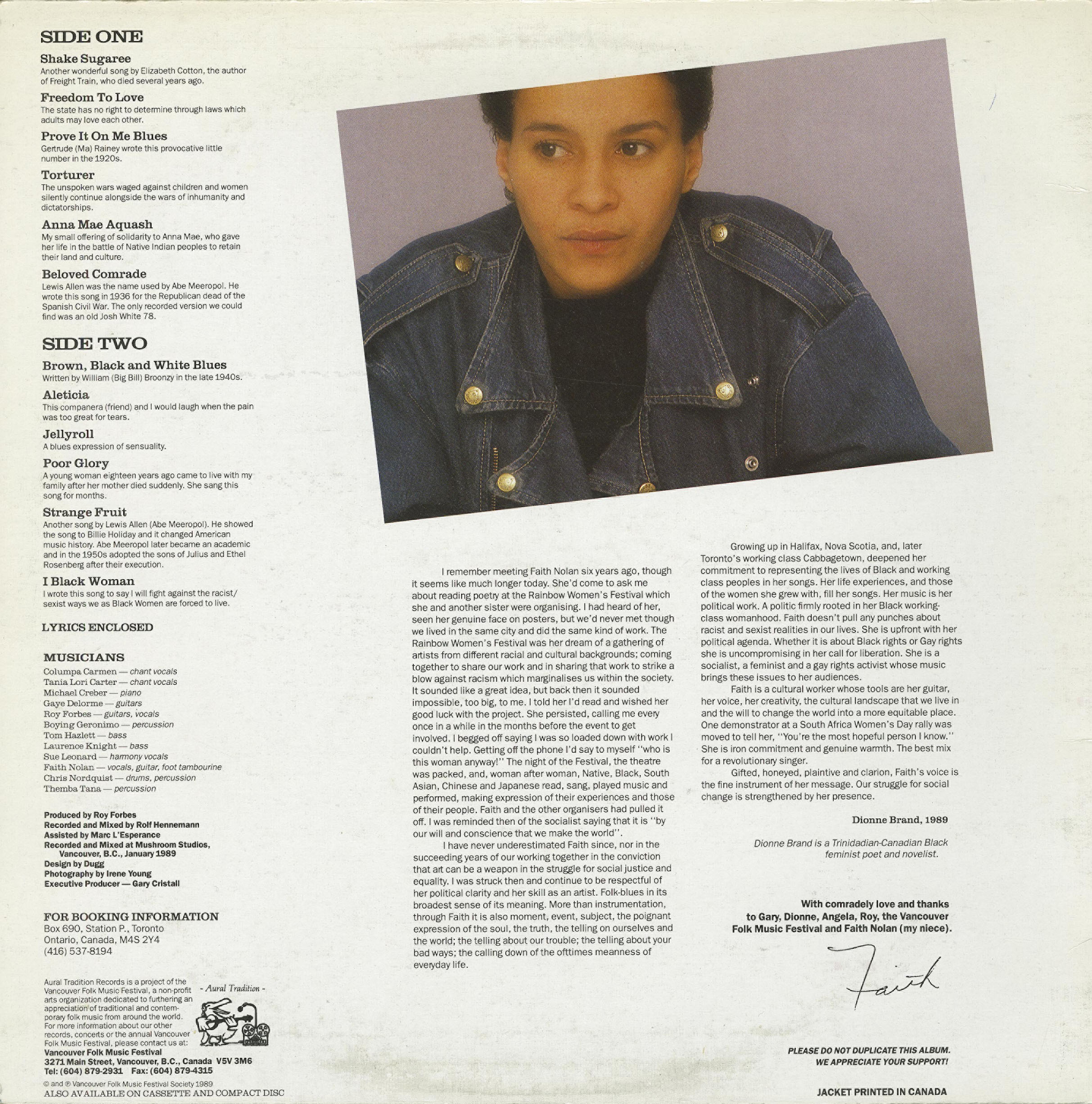 to Gary, Dionne, Angela, Rob, the Vancouver Folk Music Festival and Faith Nolan (my niece).