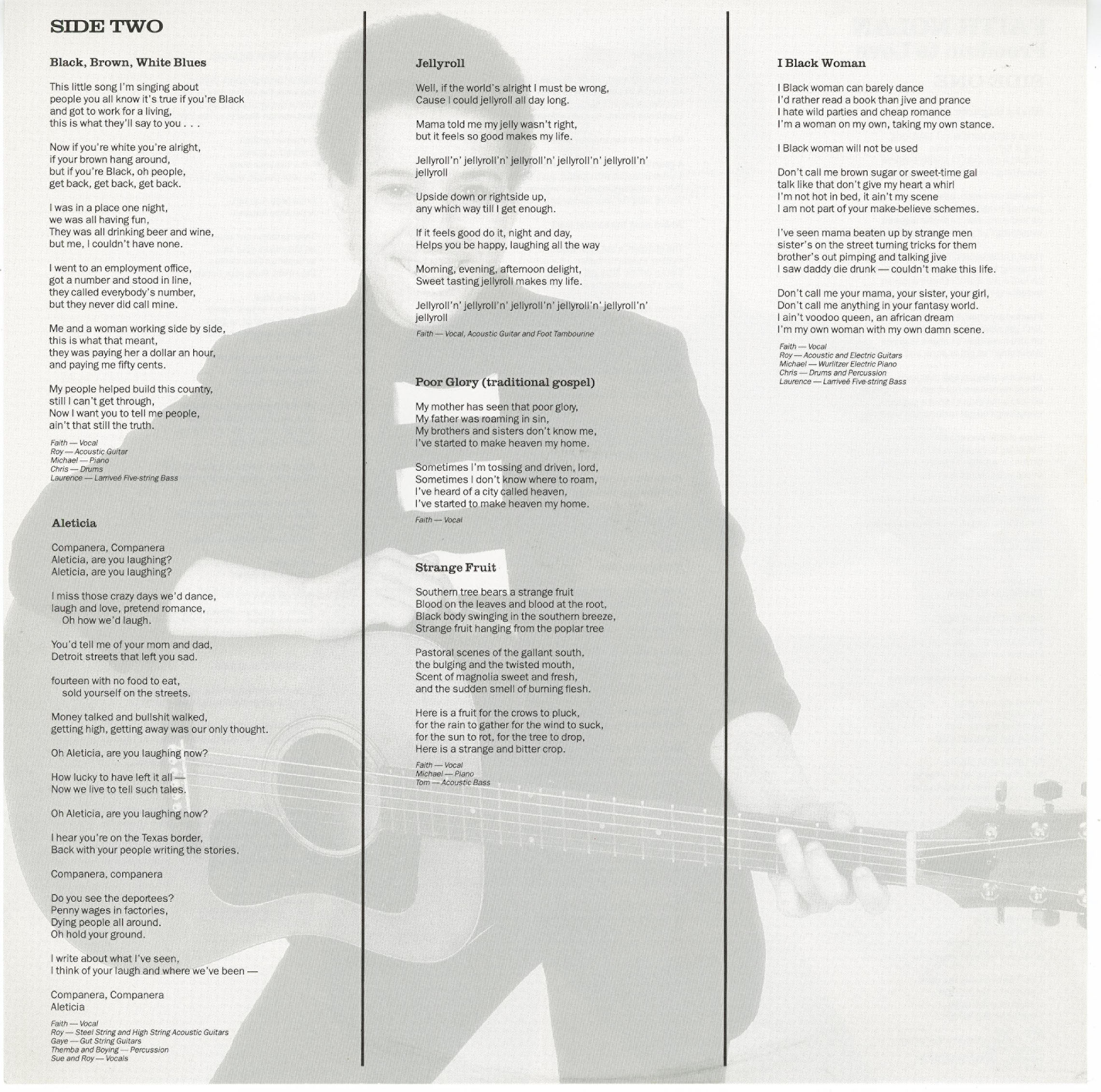 Faith Nolan: vocals, guitar, foot tambourine
