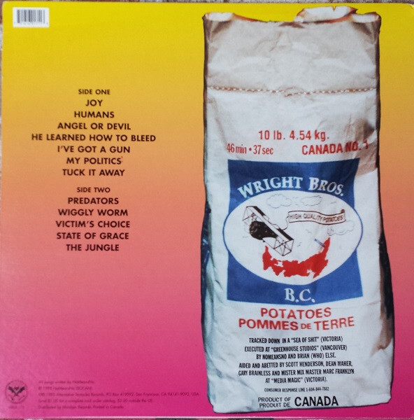 Not that this is a particularly happy disc, necessarily, taking on the usual NoMeansNo themes: personal pain ("State of Grace"), personal (ir)responsibility ("Tuck it Away," "My Politics"), socially-bred violence ("He Learned How to Bleed," "I've Got a Gun"), nice stuff like that. Almost every song is a standout.