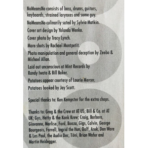 The biggest change, though, is that NoMeansNo seem to be having fun again. The word I keep thinking is "exuberance." There's probably more energy in this CD than in the band's last three or four combined. Bassist Rob Wright, the most prominent vocalist this time out, seems hardly able to contain himself, like the proverbial kid in a good used CD store. When he snarls, it's scary, and when he bellows in the way only he can, you can hear the massive grin that often contorts his face when he plays.