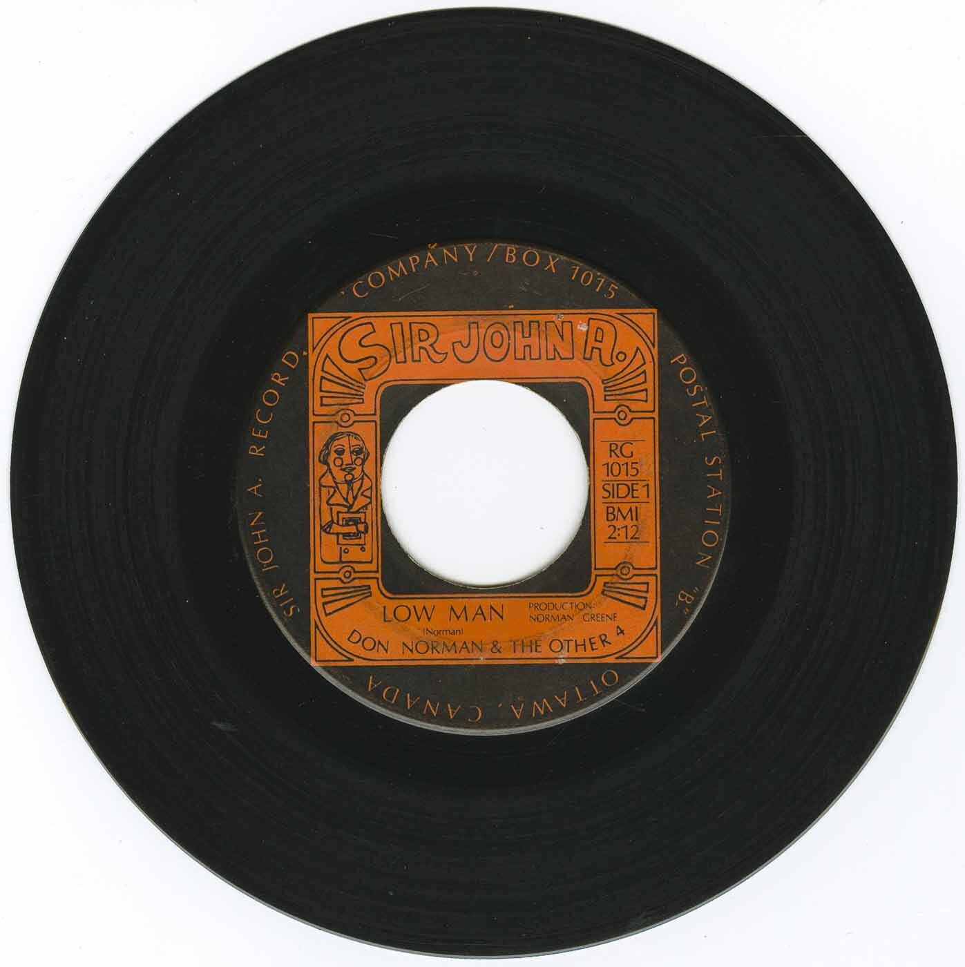 Dissatisfied with the record’s promotion, the band and manager John Pozer turned to the newly formed Sir John A label, resulting in the release of “Low Man” b/w “Mustang Sally” in late 1966. Written by Norman and reflecting his personal frustrations at the time, “Low Man” introduced a heavier, fuzz-driven sound that would come to define the group’s legacy. Norman later described the song plainly: “‘Low Man’ was autobiographical — it reflected exactly where I was at in 1966.” The follow-up single, “Your Place in My Heart” b/w “Trae Hymn I (eca/lp-Ruoy),” pushed experimentation further, famously presenting the A-side played entirely backwards on the flip. In live performance, Norman’s vocal versatility was equally striking; he recalled that when the band covered Sonny & Cher’s “Baby Don’t Go,” he sang both vocal parts himself. Summing up the band’s impact at the time, RPM concluded: “Don Norman and The Other Four are a group to keep an eye on. They have that ‘tuff’ sound.” Pressed in extremely limited quantities, these records later came to be regarded as touchstones of Canadian garage rock, their impact far outweighing their modest original circulation.