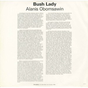 Bush Lady is the only LP ever made by Alanis Obomsawin, a member of the Abenaki First Nations and best known as one of Canada’s most accomplished and decorated documentary filmmakers. Less well known is that Obomsawin began her artistic career as a singer-songwriter in the 1960s, part of a broad movement of Indigenous artists from across North America rallying in new assertions of cultural consciousness, political rights, and reckonings with oppressive colonial history. She was invited by Folkways to perform at Town Hall in New York City in the early 1960s and spent that decade primarily identifying as a singer, channeling traditional songs hand-in-hand with modern composition. Twenty years later, amidst her burgeoning film career, Bush Lady was born of sessions sponsored by CBC Radio in 1984. Unsatisfied with these recordings, Obomsawin reclaimed the master tapes, remade the album, and issued it on her own private press in 1988. This unique, profound, magical record has been out of print and gaining cult status ever since.