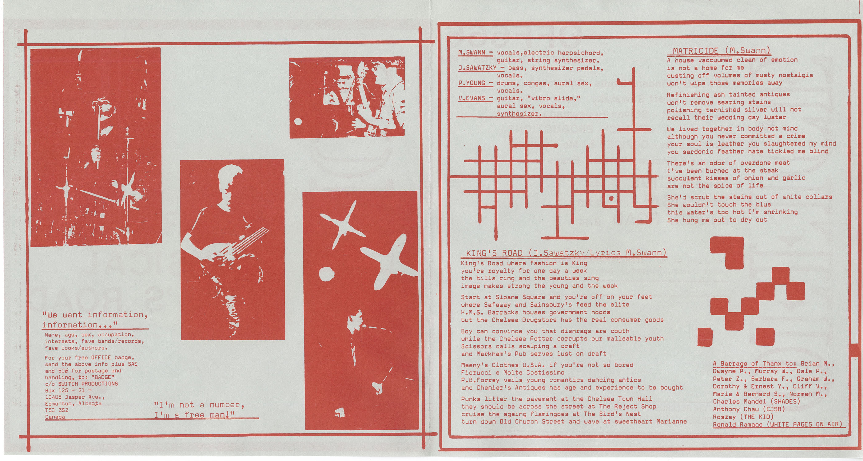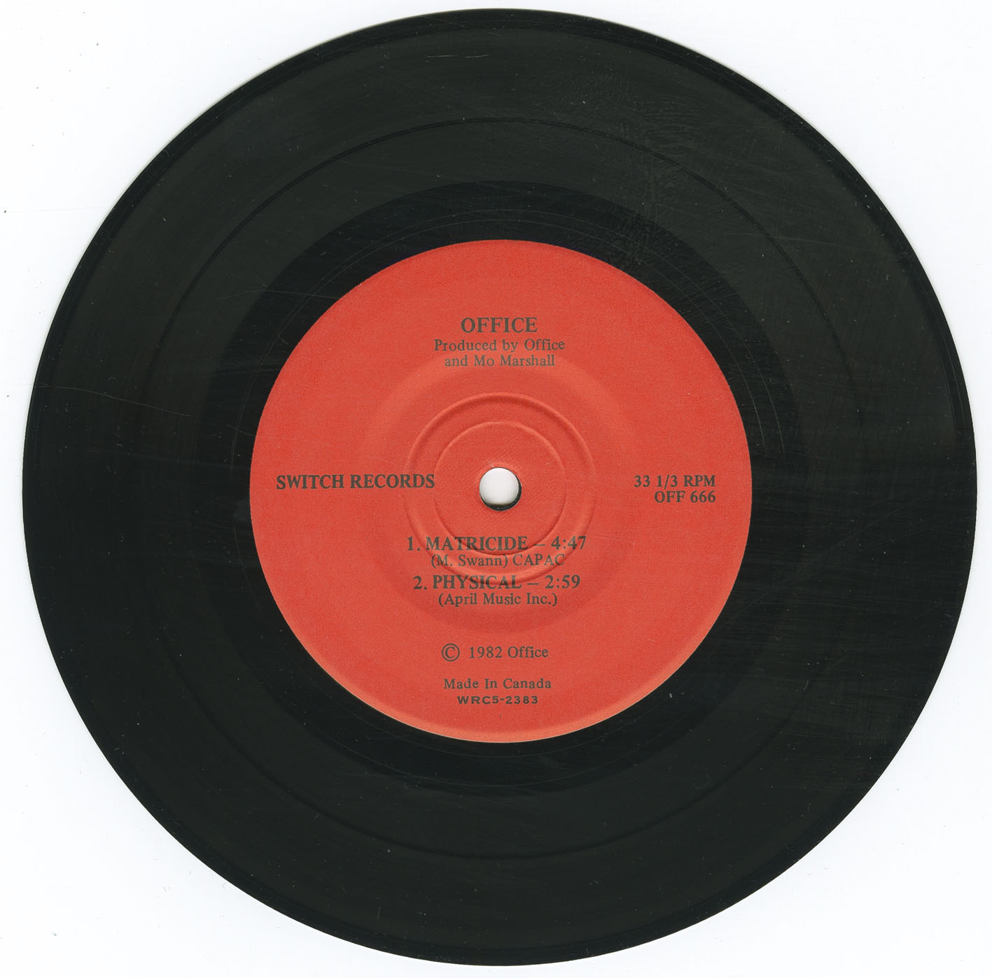 OFFICE was an art-rock, prog/punk outfit from Edmonton, Alberta, Canada circa 1980-83. Band members included Vincent Evans, Phil Young, Malcolm Swann and Jeff Sawatzky. Were quite popular in the music scene in Edmonton and Calgary playing many reknown gigs and even opening for Duran Duran in their heyday. The song 'Physical' (a tongue-in-cheek remake of Olivia Newton John's hit) actually made it onto the charts on Canadian college radio. Known for their bizarre stage shows and excellent musicianship OFFICE unfortunately disbanded in 1983 when Swann and Sawatzky left to form another popular Edmonton group called 'VOICE' with Dwayne Goettel of Skinny Puppy fame.