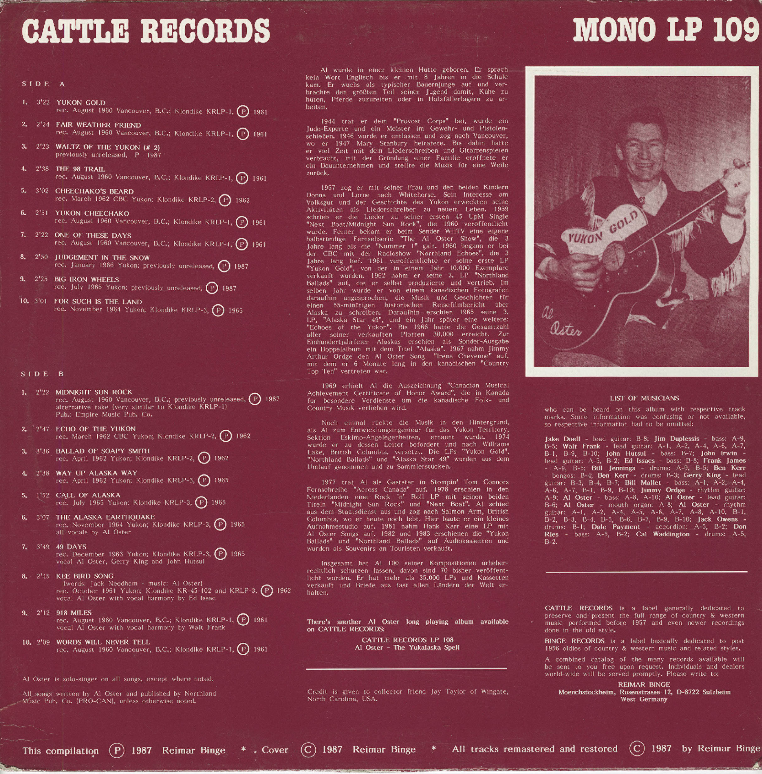 Recognizing the stories around him as untapped cultural gold, Oster formed Klondike Records and recorded his first LP, Yukon Gold, in 1960. He had gathered a small group of musician friends in Vancouver, recorded the songs on a Tandberg tape machine, and then converted them to a 15 IPS master for pressing at Quality Records in Toronto. The album, limited to an initial run of 1,000 copies, became a fixture in Yukon homes and tourist shops and is widely regarded as the first rock and roll album recorded in the Yukon. It also marked the beginning of his lifelong mission: to preserve northern history, characters, and legends through song.