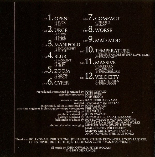 John Oswald's piece de resistance. Twenty minutes of some of the most insane editing, cross-fading, beat matching, cultural name dropping and sampling. No other work even comes close to the intensity of Plexure. John Oswald proves he is a virtuoso of Pro Tools, over a thousand different artists edited, spliced and mixed together. Many of the sampled pieces are just long enough to be recognizable and yet short enough that by the time you can consciously identify the track your ears have been pummeled by another 15, and all matched up as seamlessly as humanly possible. One of the most beautiful and simultaneously insane and aggravating experiences in audio ever produced. A must listen and a must have.